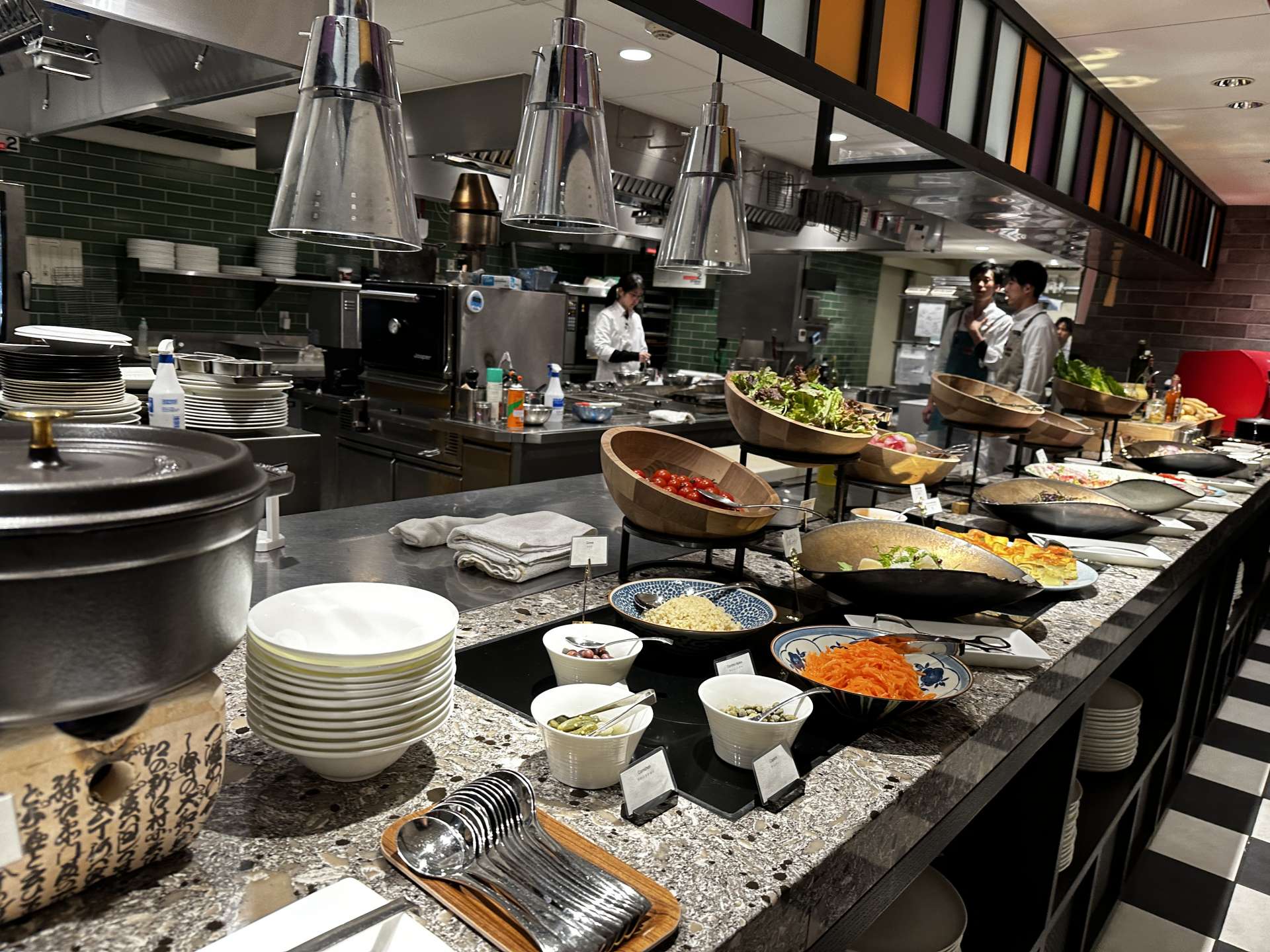 オープンキッチンがスタイリッシュなグリル料理のレストランです。ランチブッフェはWell-being(ウェルビーイング)をコンセプトに、ヘルシーな食材や豆乳スムージー、デザートが楽しめます。メインディッシュは選べ、作り立てをオープンキッチンからテーブルまで運んでくれます。