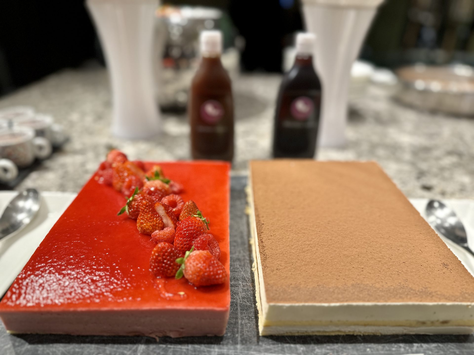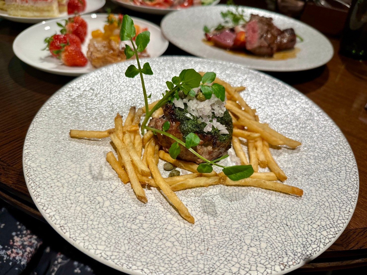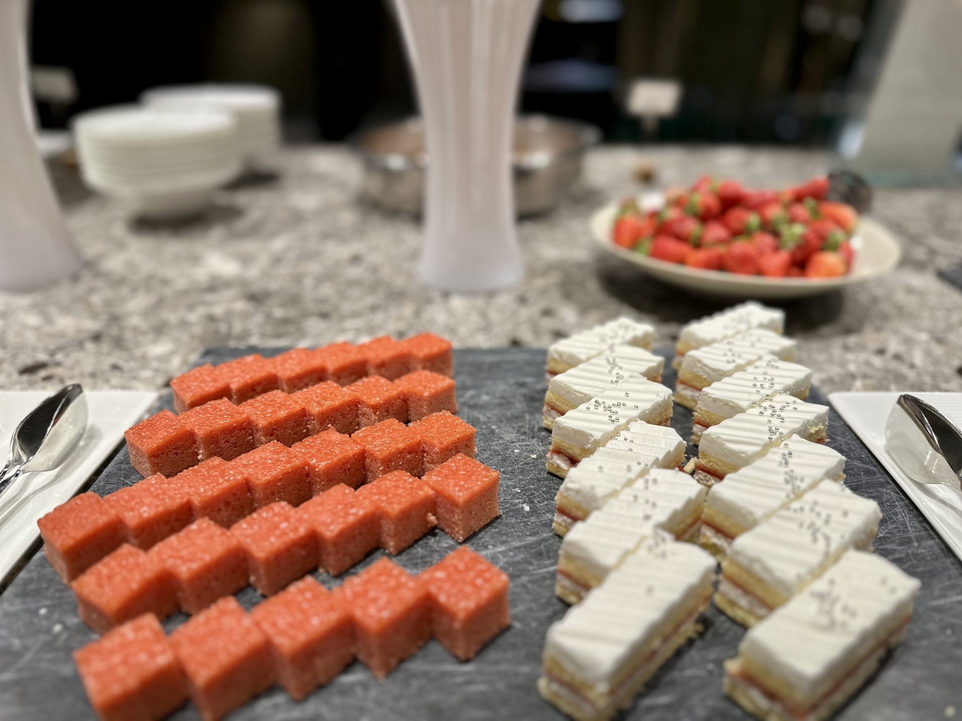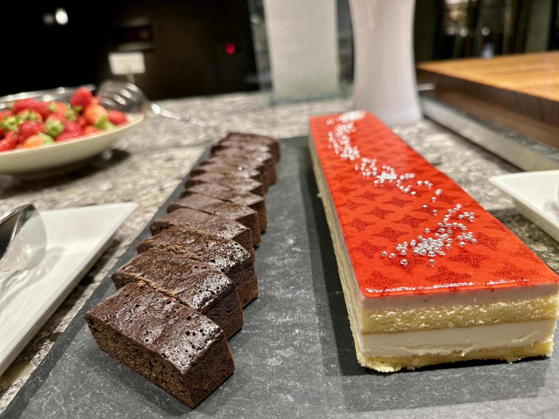 一生懸命作って下さったシェフ達に感謝しながら、全部食べたいブッフェ、そこで筆者の食べ方として、あくまでも、気心しれた友人と行く場合ですが、最初は全種類1個ずつお皿にのせ、写真撮影をし、食べるときに、未使用のナイフとフォークで半分にカットしてシェアします。