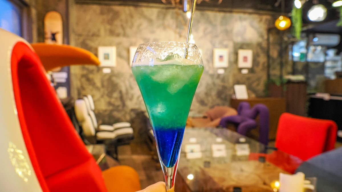 マドラーでくるくるとカクテルを混ぜると、南国の海の色、エメラルドグリーンに早変わり。