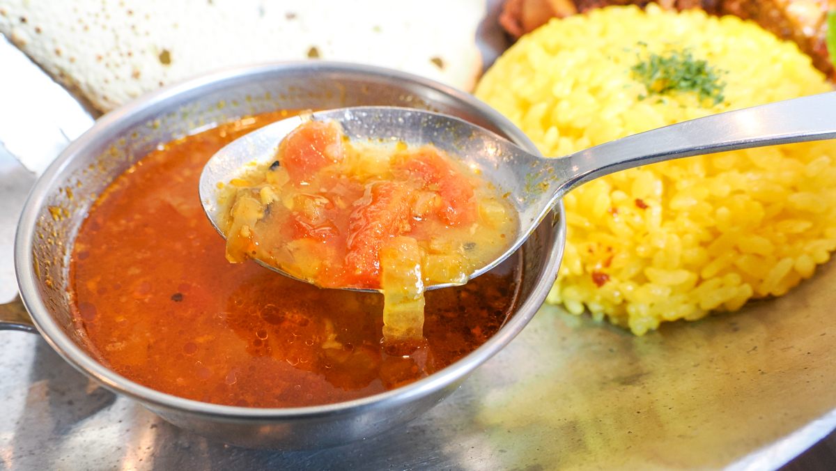 スパイスを使っていたり、カレーがついたり、いっけん、インドのカレーのような辛さを思い浮かべるかもしれませんが、ほどよいスパイシー感のやさしい味つけが特徴です。
