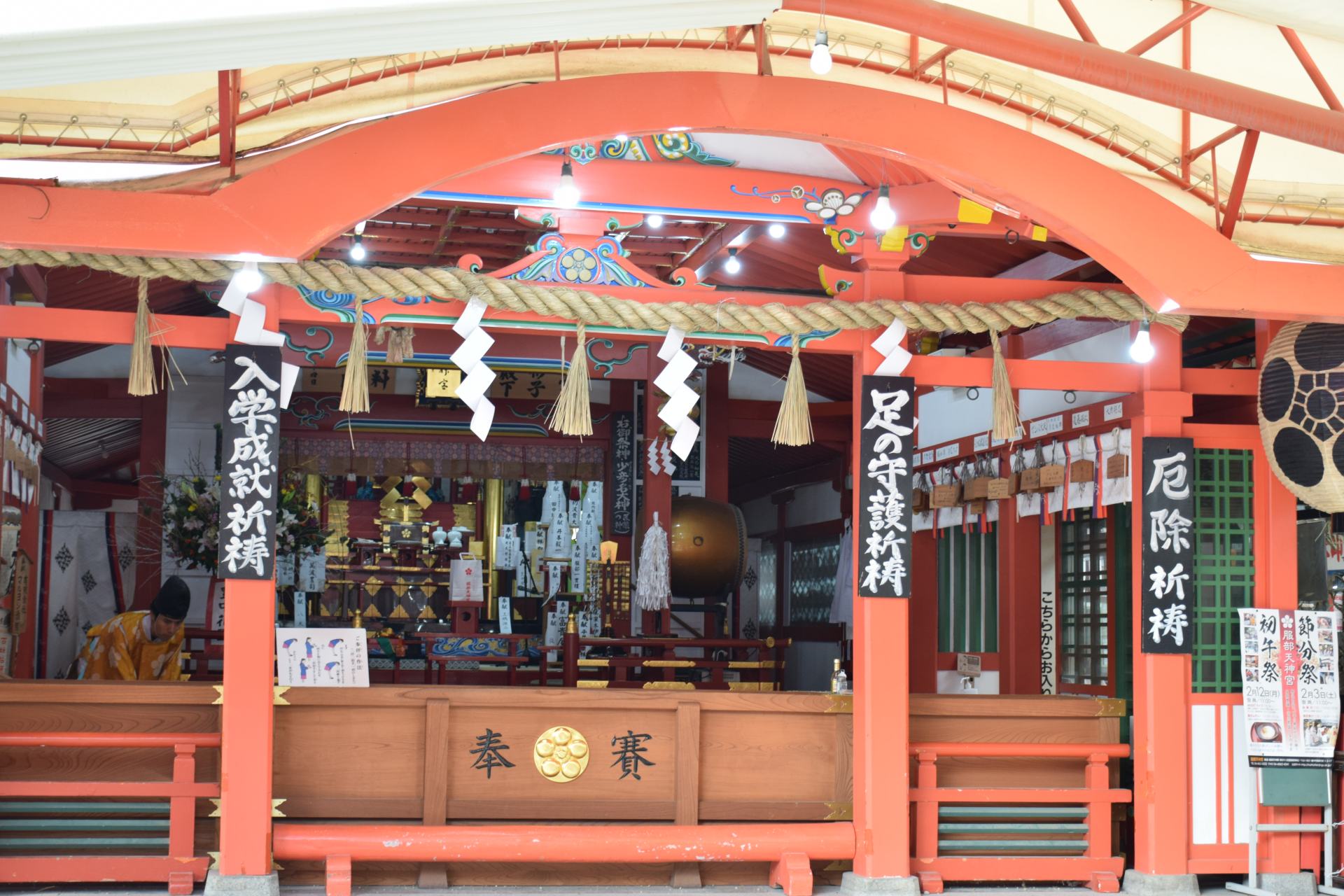 菅原道真公が大宰府への道中、足の病にかかった際に、この地で祈願をすると病気から快復して無事大宰府へ到着されたというところから、菅原道真公の足を触って足の健康を祈願します。