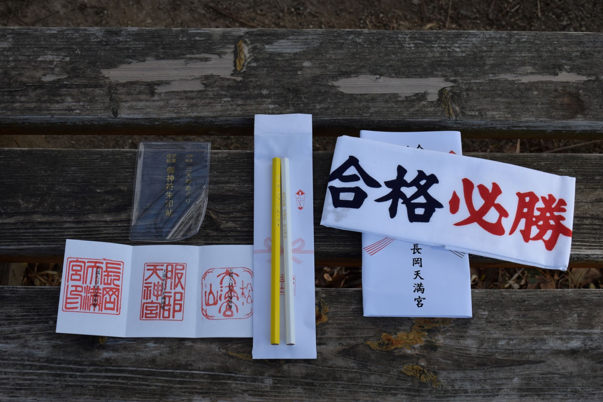 左から、三社の朱印を押していただいた携帯用朱印帳、合格鉛筆、必勝祈願鉢巻です。