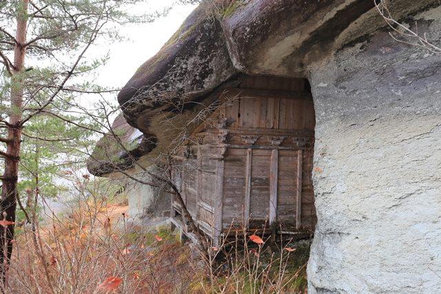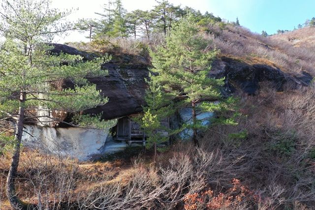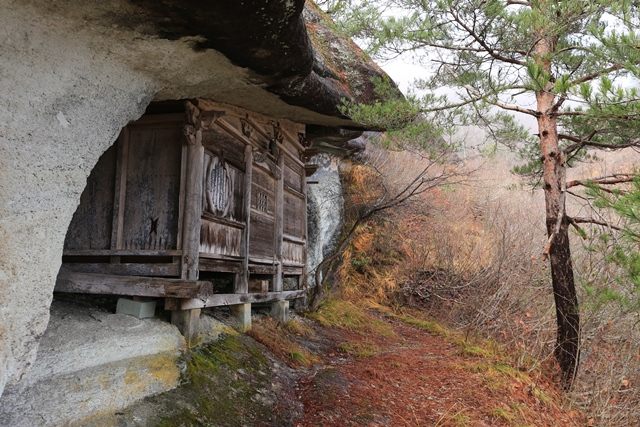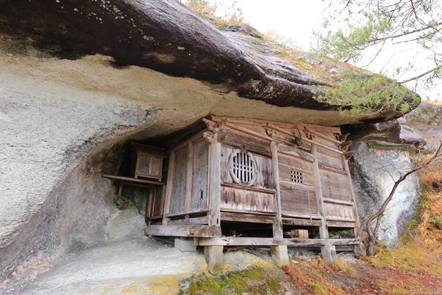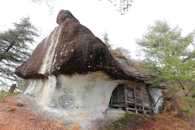 奇岩に囲まれた弘法岩屋へ。屋根部分に当たる岩塊は、まるで寄棟の様に見える形が特徴的です。
