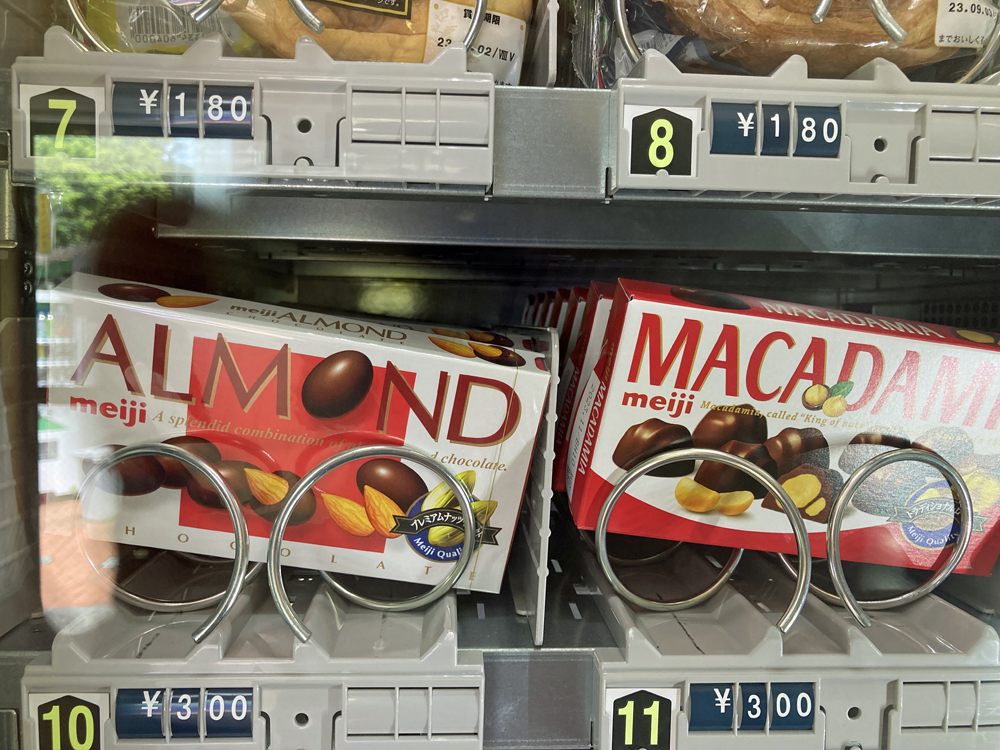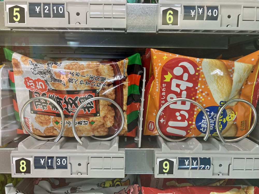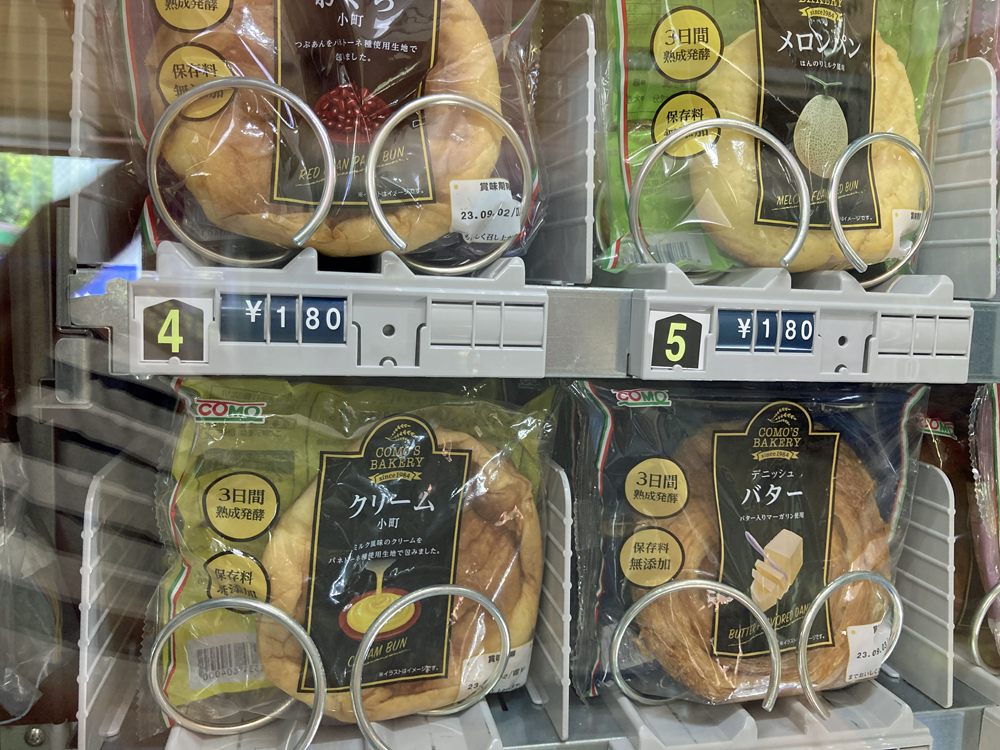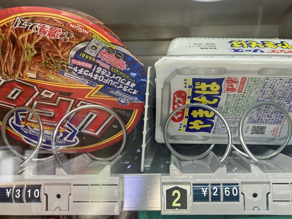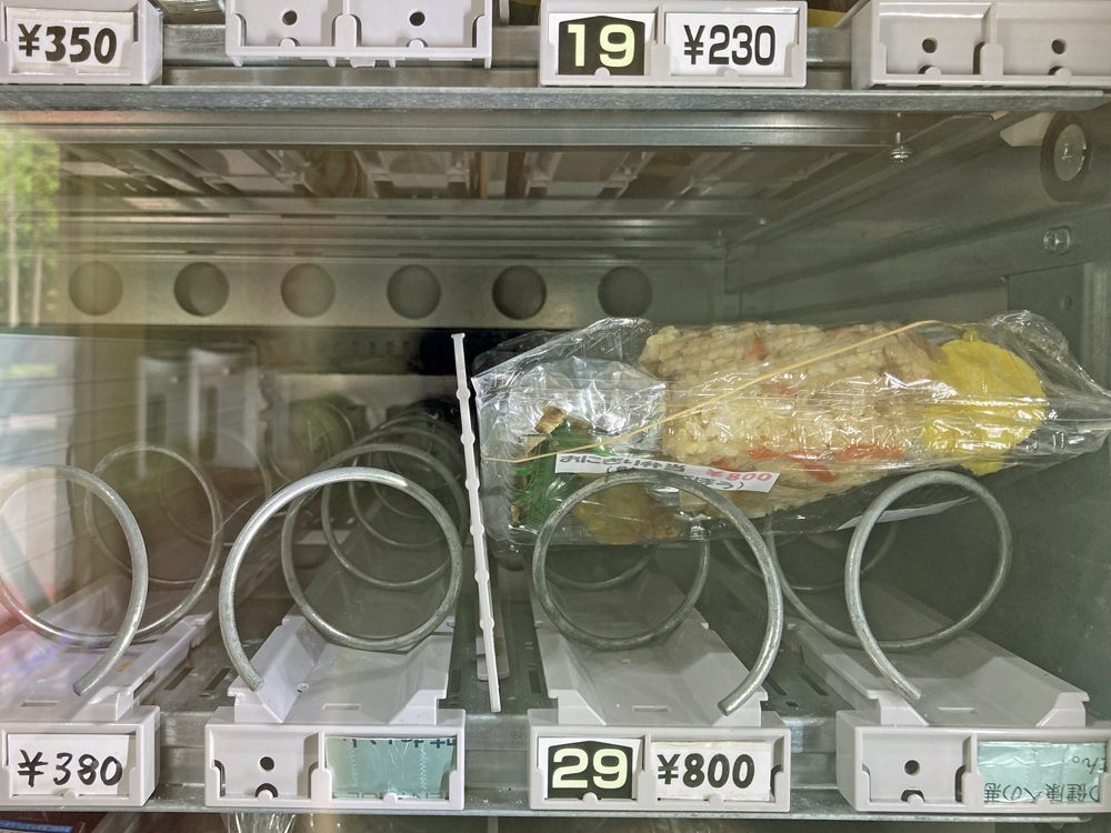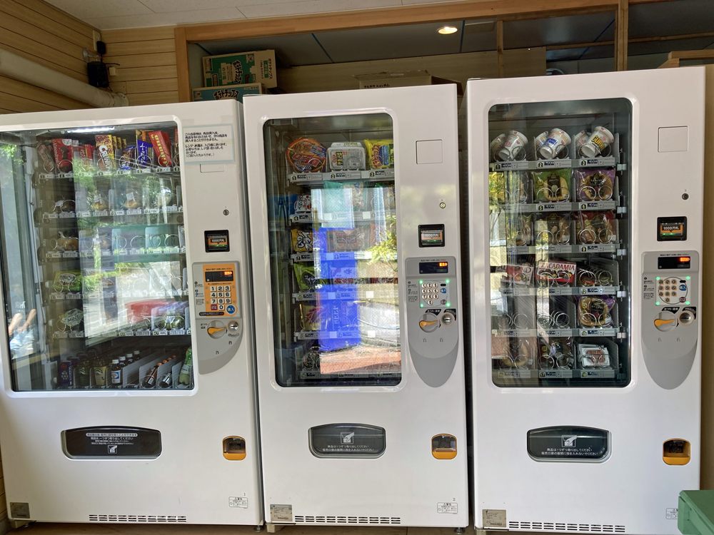 店内には自動販売機が設置されていて、スナック菓子、カップ麺、パンのほか、冷蔵機能のある自動販売機では弁当やスイーツを購入できます。