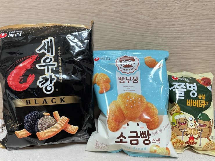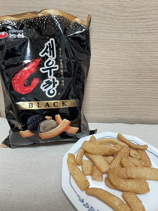 パッケージと中身を見て、あれ? カルビーのかっぱえびせんかなと思われたかもしれませんが、韓国では、セウカン(새우깡)と呼ばれるスナック菓子です。日本の元祖より少し遅れて1971年に農心より発売され、韓国国民お菓子として現在も人気です。2021年にセウカン50周年の記念商品として写真のセウカン ブラックが発売されました。ブラックはえびのスナックにトリュフの香りと味のする刺激的なお菓子です。