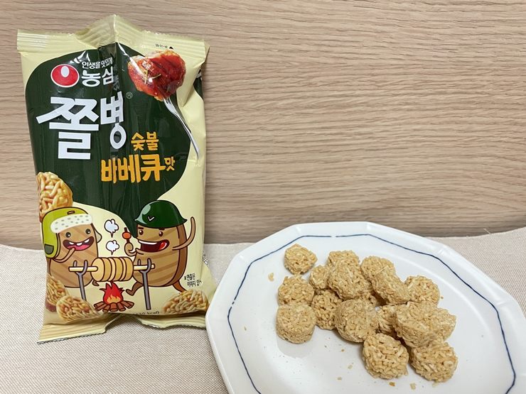 韓国ではインスタントの袋麺に粉を入れて食べる人がいるくらいインスタントラーメンが好きな国ですが、それを圧縮したようなお菓子がチョルビョン(쫄병)です。辛い味がオリジナルフレーバーでこちらの炭火バーベキュー味は甘じょっぱく香ばしい味です。ちょっとしょっぱいので、ビールと合います。