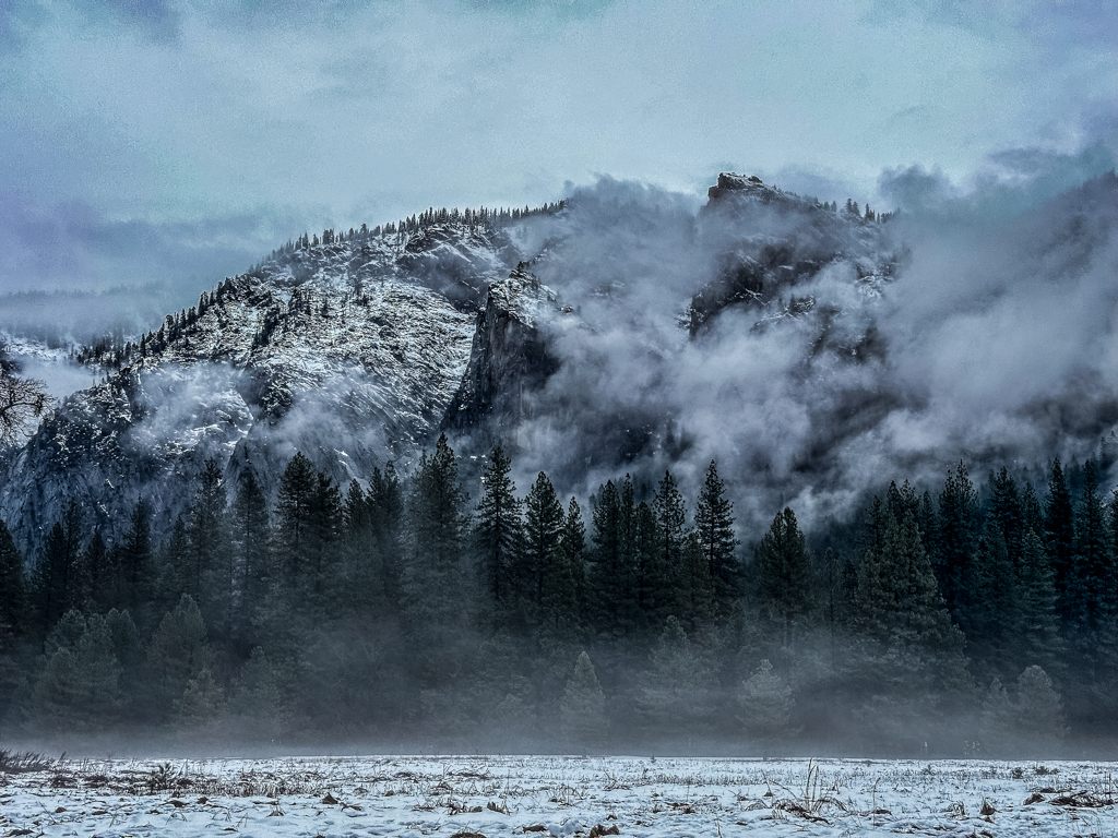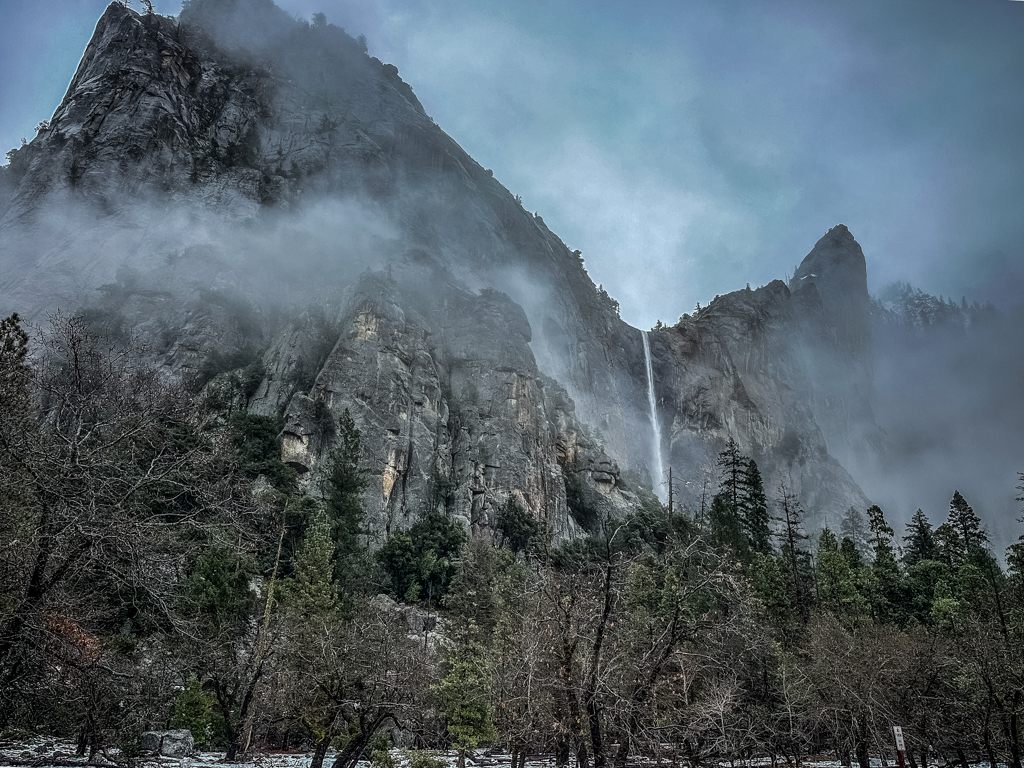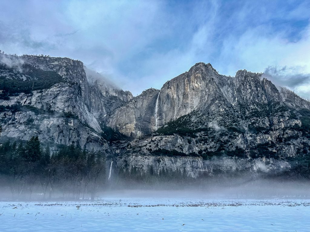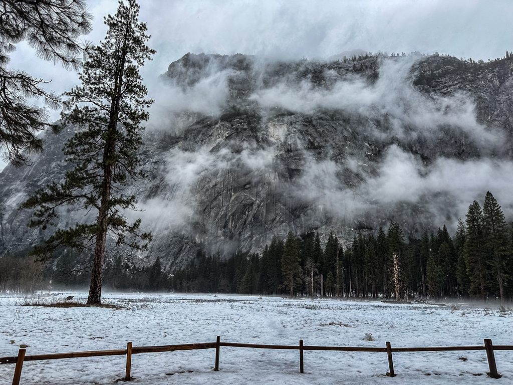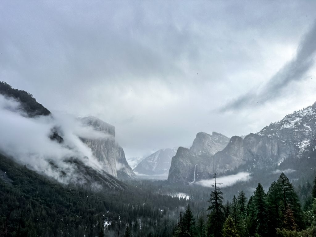 トンネルビューからの景色も雪のなか。1000mの断崖に雲がかかって幻想的です。Half Domeは雲のなかでした。