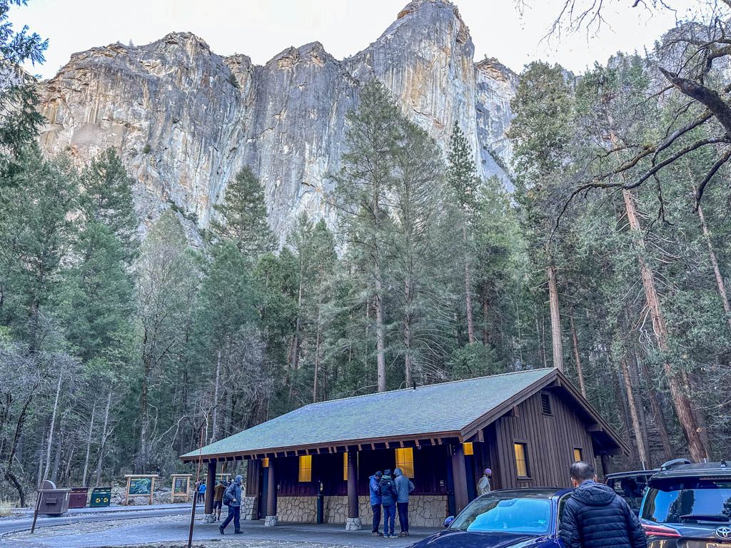 その昔、クックさんがホテルを経営していたクック草原も、すっかり雪に覆われています。Sentinelブリッジの北の駐車場からの眺めです。草原に整備された遊歩道を少し歩いてみましょう。YosemiteFallのシャトル停留所からも歩いてすぐです。