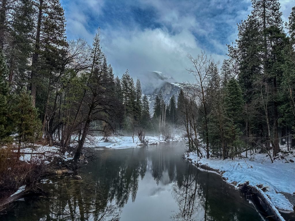 センチネルブリッジから見える川辺も雪に覆われています。運よくHalf Domeが顔を見せてくれました。