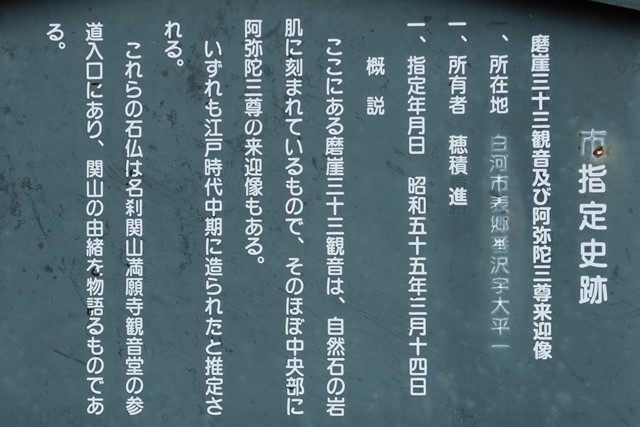 帰り道、近くにある<a href="https://www.city.shirakawa.fukushima.jp/page/page001414.html" target="_blank">磨崖三十三観音</a>に立ち寄ってみました。自然石に彫られたという江戸時代中期の観音像が並ぶ史跡です。満願寺への参道入口(硯石登山口)に当たり、関山の由緒を物語るものとされています。