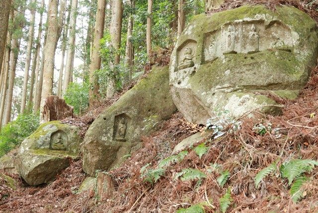 磨崖三十三観音は案内板奥の杉林内にあり、道路沿いに見ることが出来ます。