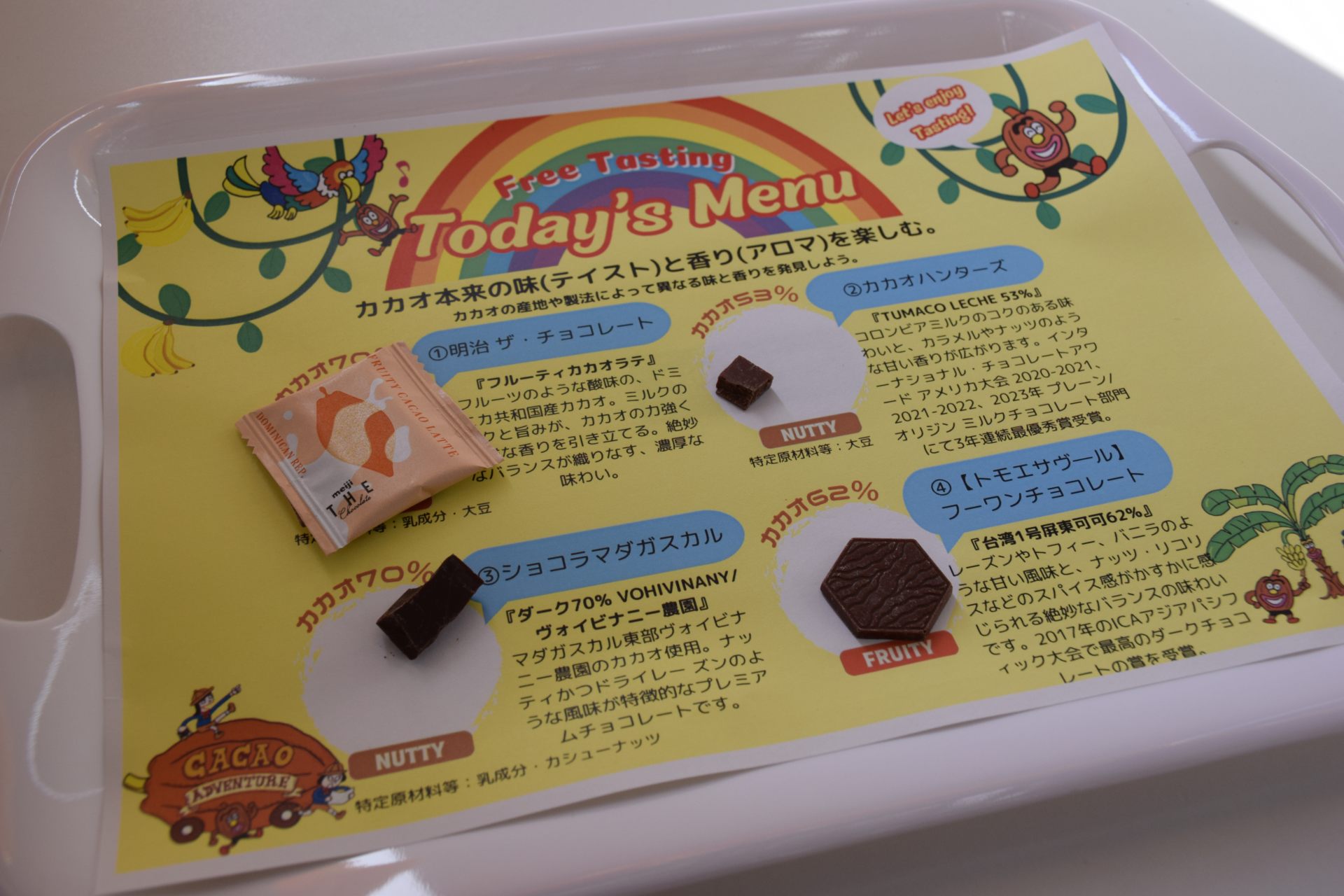 チョコレートのテイスティングが各日限定80食が無料で試せますので、会場に早く行くことができたらぜひもらいに行ってくださいね。