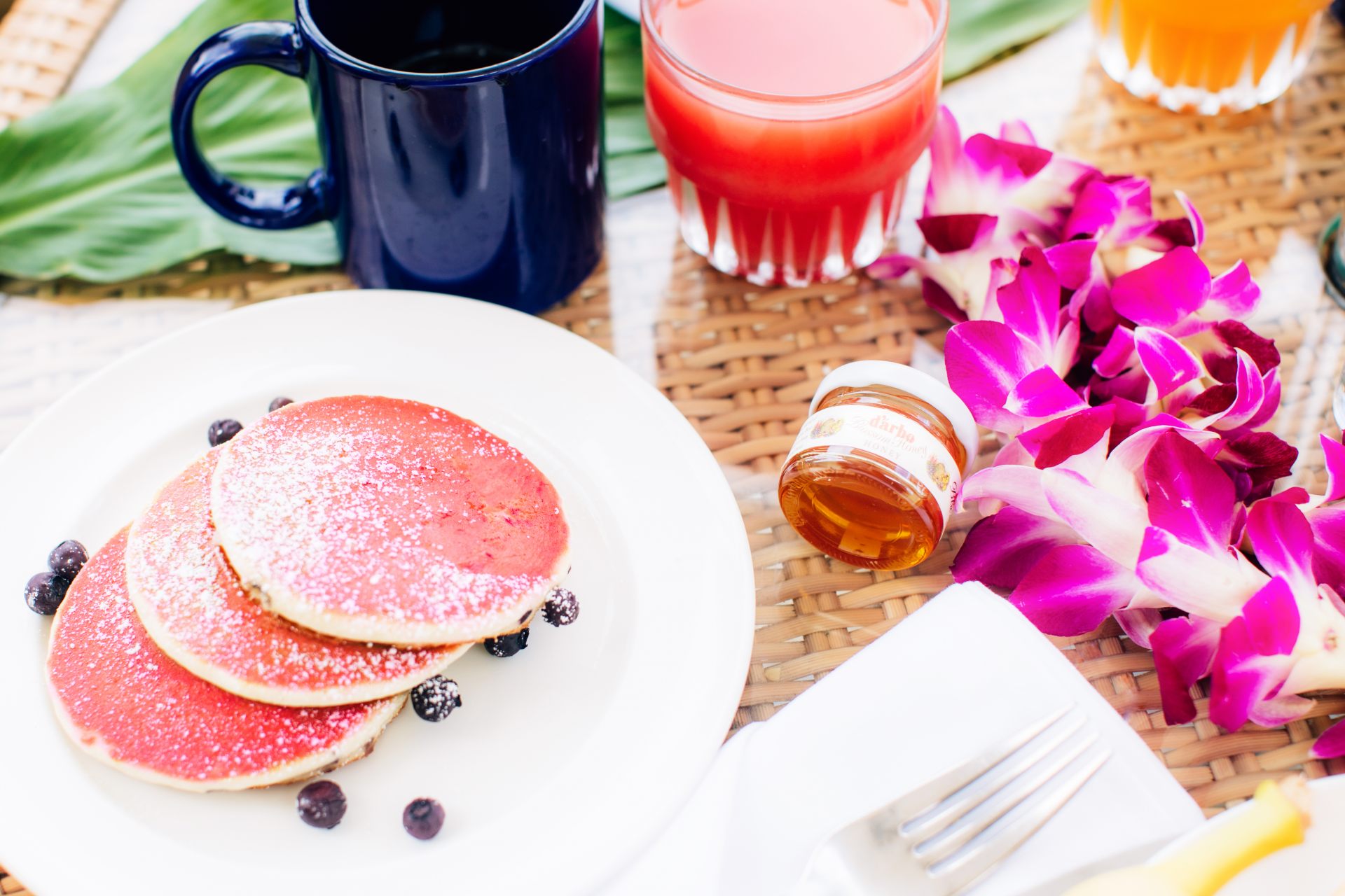 このピンク色のパンケーキ&ワッフルにフレッシュクリームやホイップクリームをトッピングすると、愛らしいバレンタイン仕様のパンケーキ&ワッフルのできあがり! 間違いなくインスタ映えしますよね。