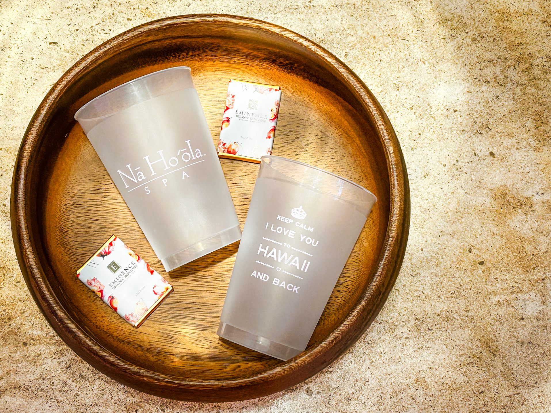 2月14日にスパを利用すると、「ナ ホオラ スパ」のオリジナルカップと施術で使用しているスパプロダクト ブランド「エミネンス」のロゴ入りミルクチョコレートをもらえます。カップには、「ナ ホオラ スパ」のロゴと「I LOVE YOU TO HAWAII AND BACK(ハワイまで行って帰る距離くらい愛してる)」がプリントされています。