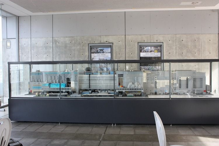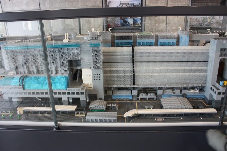 ガラスケースの中の京都駅ビル・レゴブロックは、およそ100分の1モデル。