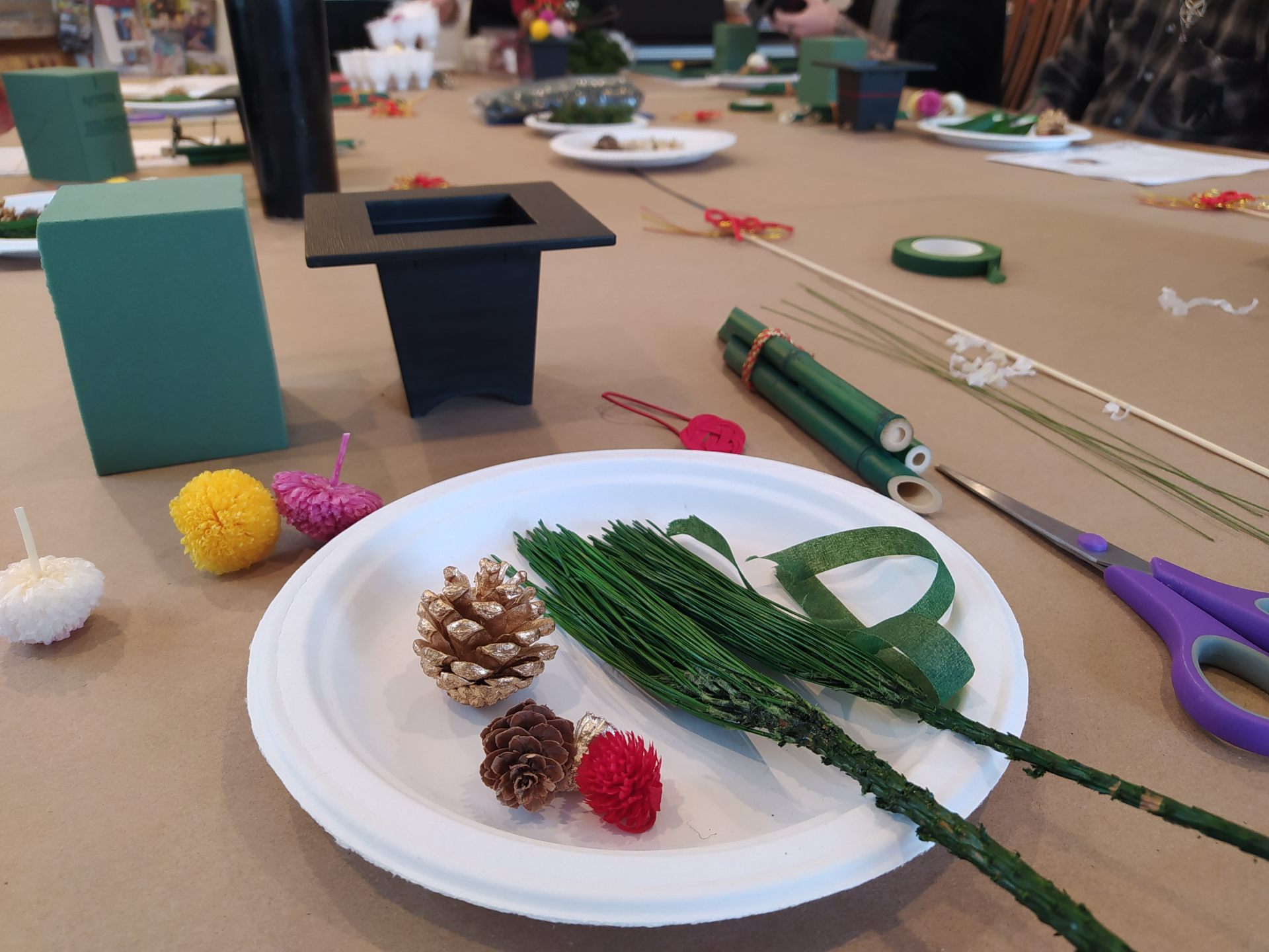 今回作るのはテーブルサイズのミニ門松。作り方のレクチャーはもちろん、ていねいなレシピに、材料がもたらすお正月に関する意味やトリビアなどていねいに教えていただき、とっても勉強になりました。