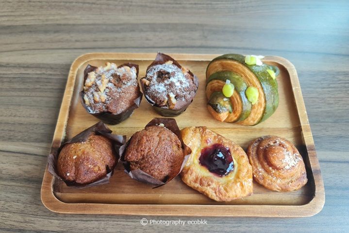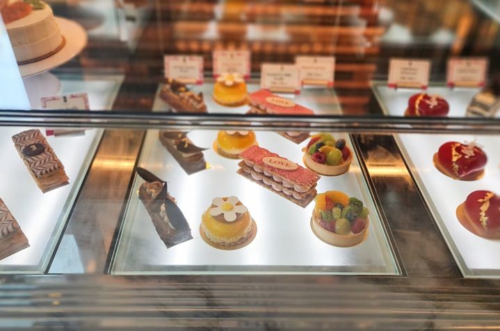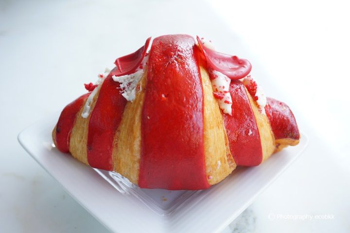 バレンタイン前には、真っ赤なハート型のケーキもあり、季節に応じたスイーツも取り扱っている印象を受けました。近年、バンコクで見かけるようになったカラフルなクロワッサンは、これまで、中には、ジャムだけが入っていることが多く、私には甘すぎて苦手だったのですが、こちらではジャムと一緒に生クリームも入っていて、わりと食べやすい甘さでした。他のパティスリーもおいしかったです。