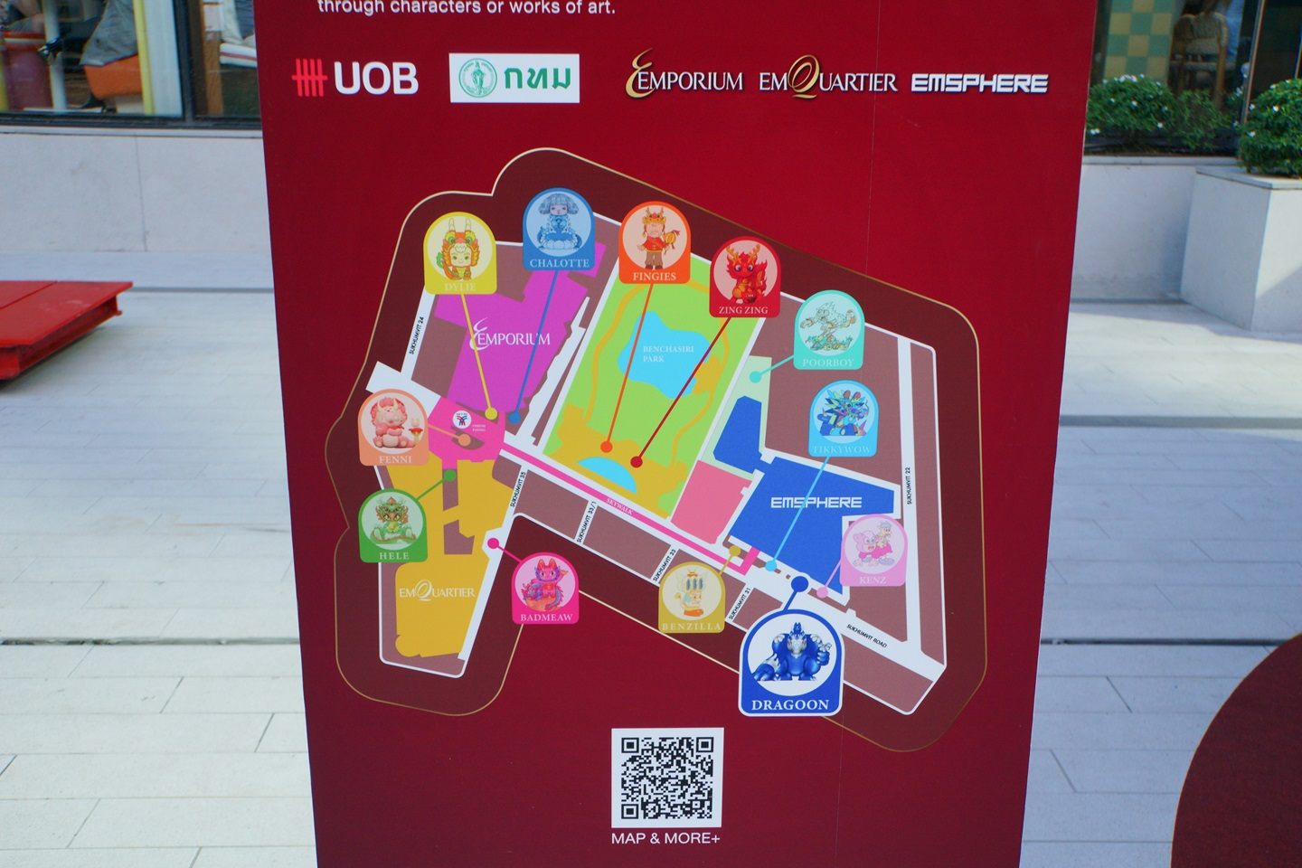 2024年2月6日~4月16日の期間中、EM DISTRICT(エンポリアム、エムクオーティエ、エムスフィア)およびベンチャシリ公園には、旧正月をテーマに、有名な12人のアーティストによって作られたキャラクター「The EMPIRE OF DRAGONS」が12体出現しています。バレンタインも意識しているのか、キャラクターの一部がハートになっていて、おもしろいなと思いました。エムクオーティエ前のキャラクター近くには、それぞれ看板が設置されており、上のQRコードを読み込むと、アーティストさんのIGが出てきて、下のほうのQRコードを読み込むと、各キャラクターの配置場所などが見られるようになっています。
