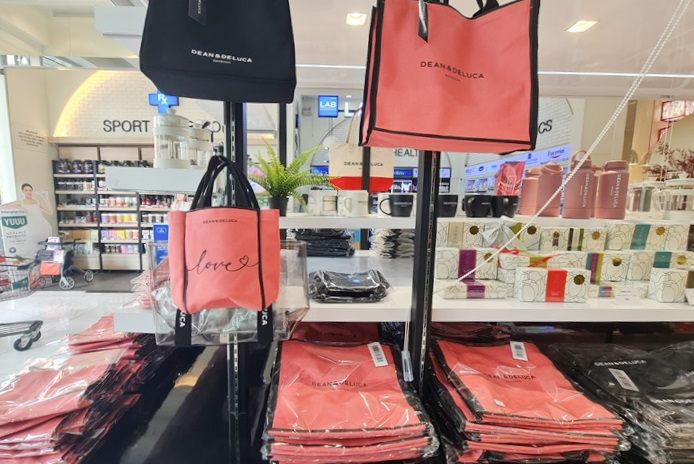 エムクオーティエ内にある「DEAN&DELUCA」はバンコクのお土産品として有名ですが、1月下旬はデニム生地3色のカバンがずらりと並んでいたのが、2月に入り、バレンタインらしい大人ピンクカラーのバック等の販売が開始されるようになりました。下の写真は、2024年2月5日訪問時の写真ですが、2024年2月8日夜には水色3色のデニム生地は見当たらなくなり、筆者は初めて見るシックなベージュカラーが加わっていました。