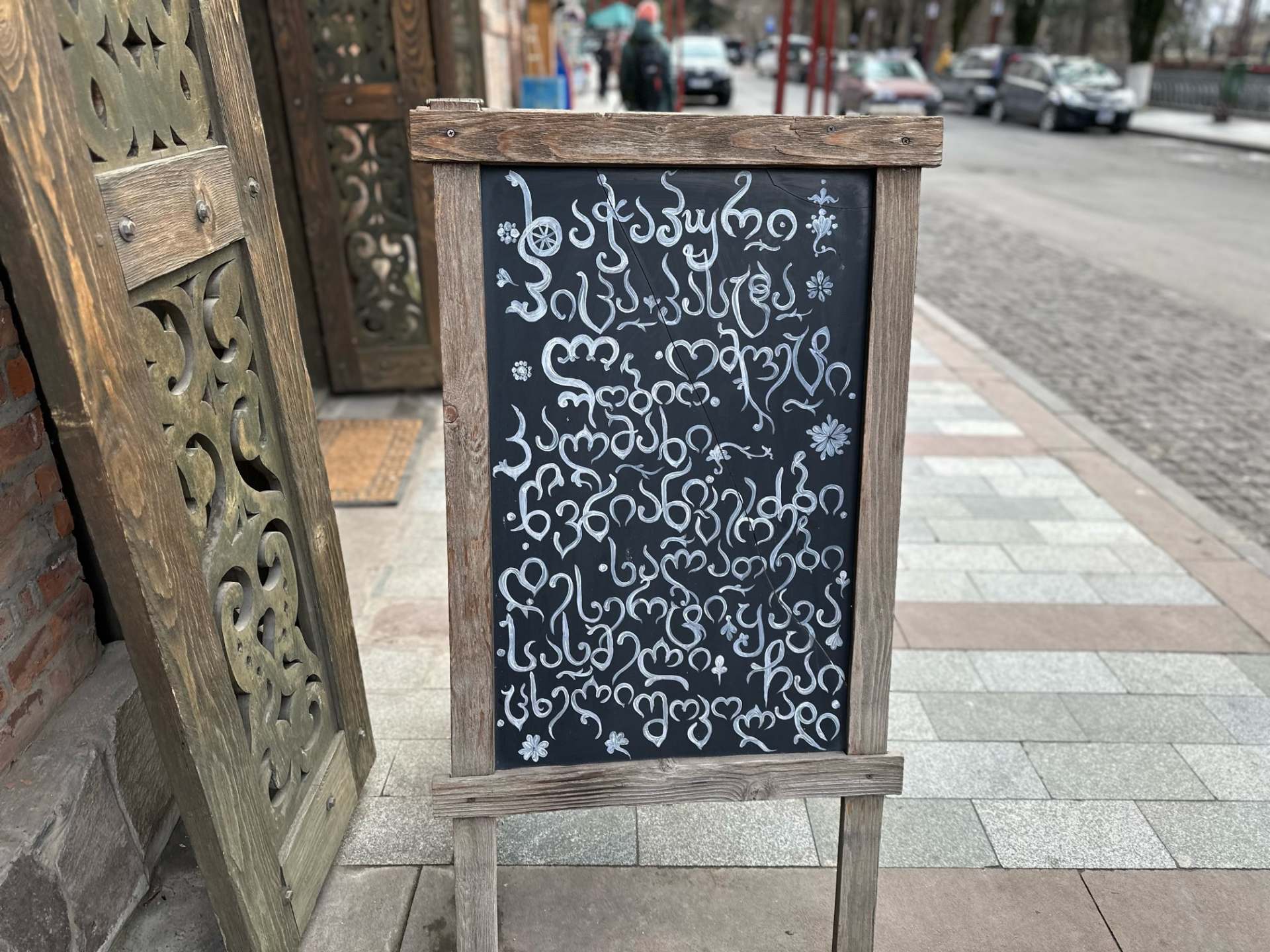 1つ目は、まず入口にあるお店の看板のジョージア文字のカリグラフィー(書道)です。