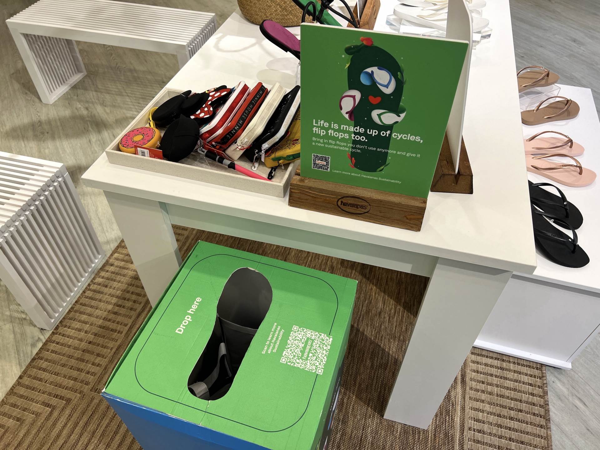 地球環境保護を第一に考えるハワイアナスでは、使わなくなったビーチサンダルを回収してリサイクルしています。店頭にリサイクルボックスを置いています。