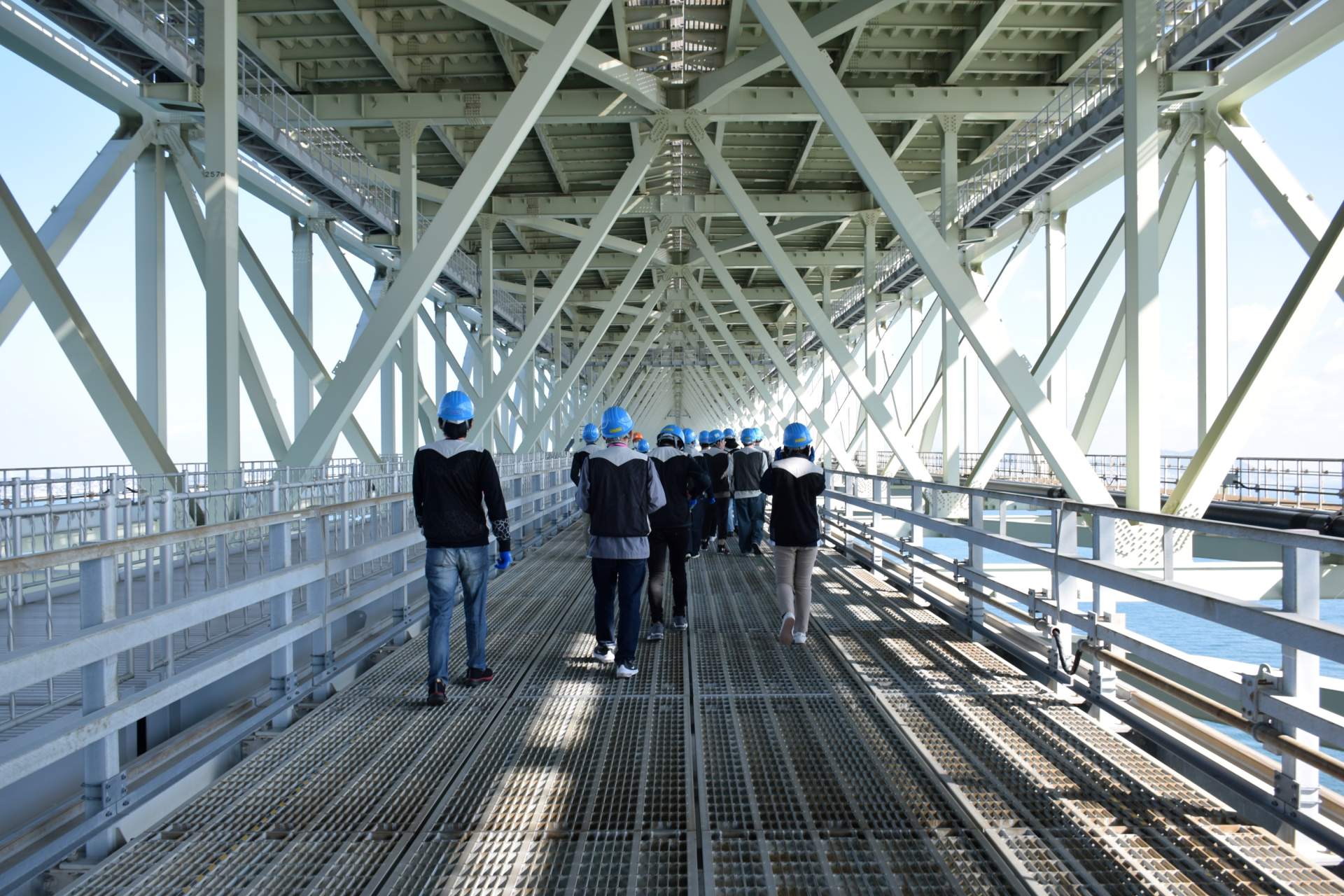 パンフレットには「普段立ち入ることができない管理用通路を渡り、海上約300mの主塔へご案内します!」と記載してあるのですがいまいち理解できず、どこにどうやって行くの? と現地で橋を目の前にしてもよくわかりませんでした。