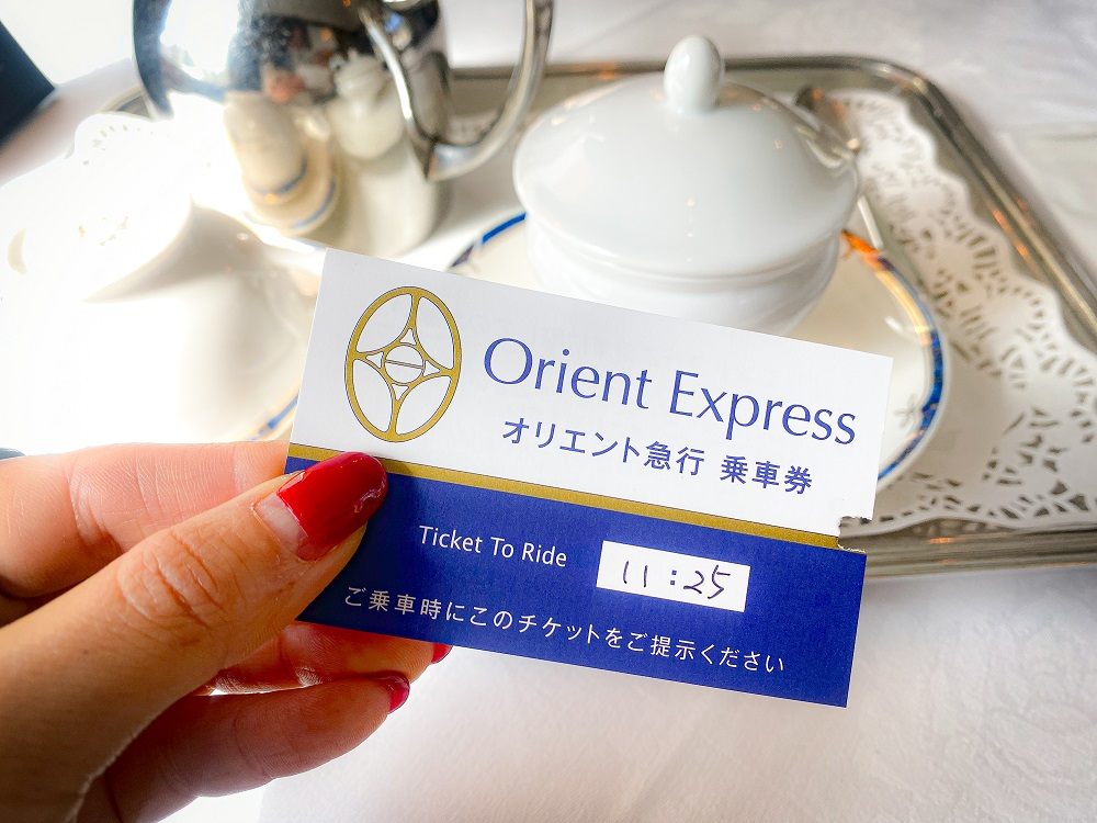 メニューは、日替わりスイーツ(ティーセット付き)2200円(税込)のみ。受付を済ませると、オリエント急行の乗車券がわたされます。電車好きの方はもちろん、そうでない方でも雰囲気があって気分が上がります。乗車券に切り込みを入れてもらったら、いざ車両へ。