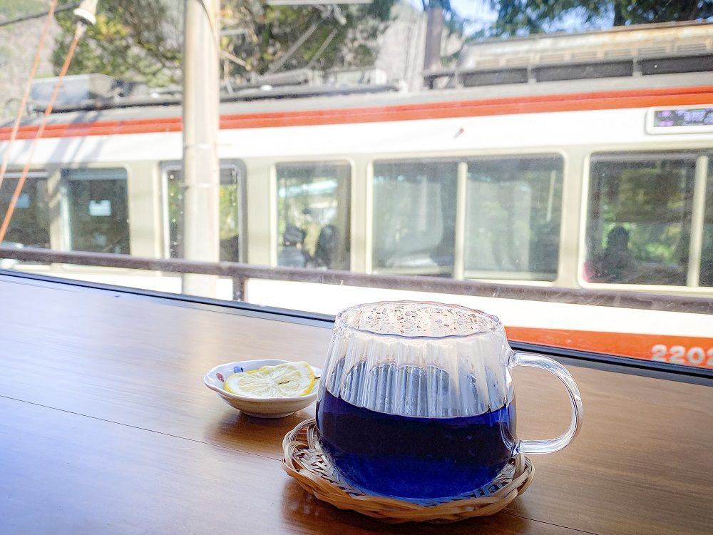 カフェでは、青いハーブティーとして知らせる「バタフライピー」を注文。鮮やかな青色が、線路沿いの景色に映えます。味わいはあっさりしていますが、レモンを入れると酸性度が変化して青色から紫色に変化するおしゃれなドリンクです。