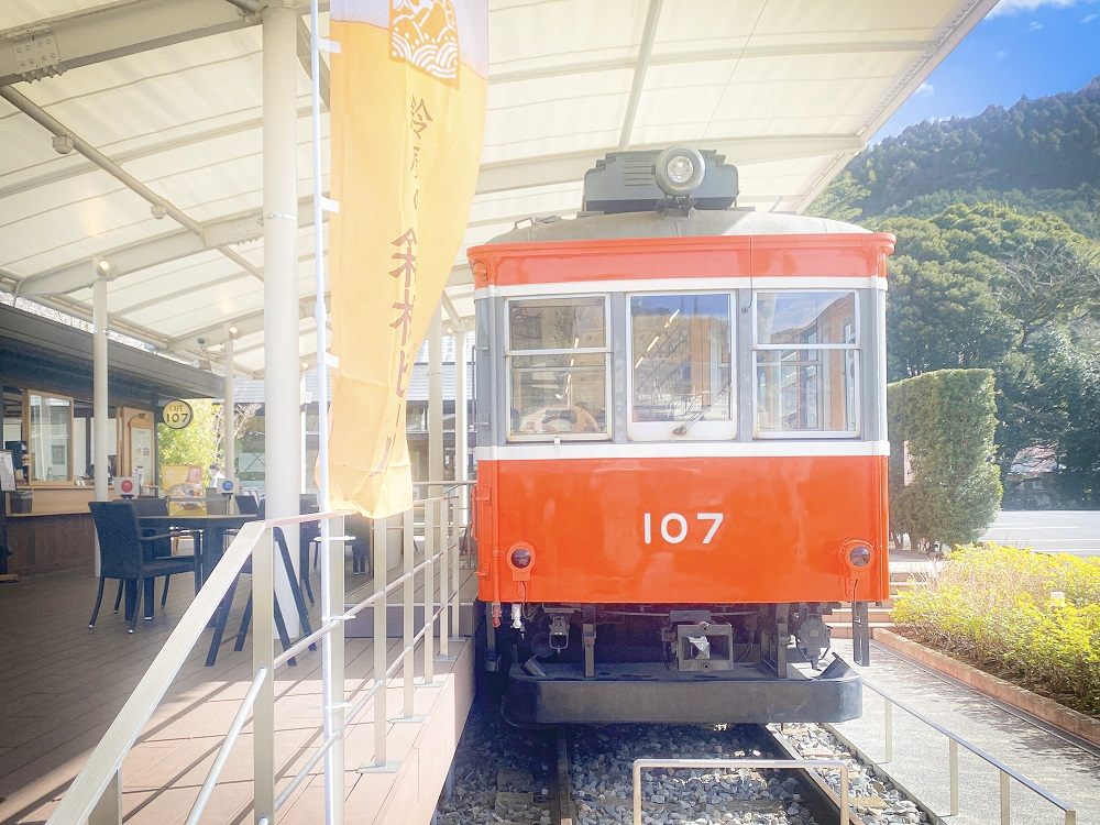 箱根登山鉄道の風祭駅からすぐ、「鈴廣かまぼこの里」の敷地内にある「えれんなごっそCAFE107」では、引退した箱根登山電車「モハ1形107号」のなかでカフェメニューが楽しめます。