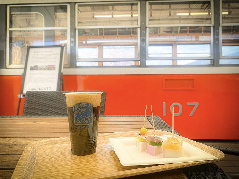 今回筆者は、箱根ビールとかまぼこピンチョス(3種)をいただきました。ピンチョスは、日替わりで3種類セットでメニューに登場するのですが、ビールの相棒にぴったりです。実はこのピンチョス、箱根登山電車107号にちなみ、107種類もあるというので驚きです。