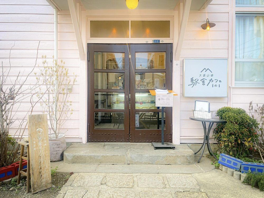駅前の階段を登ると、どこか懐かしいノスタルジックな建物がお目見え。そこが今回の目的地「大雄山線駅舎カフェ1の1」です。