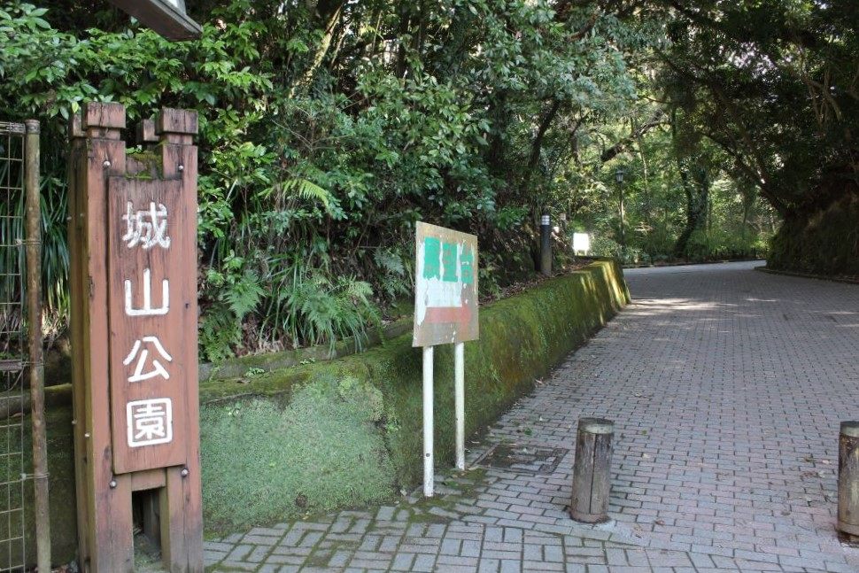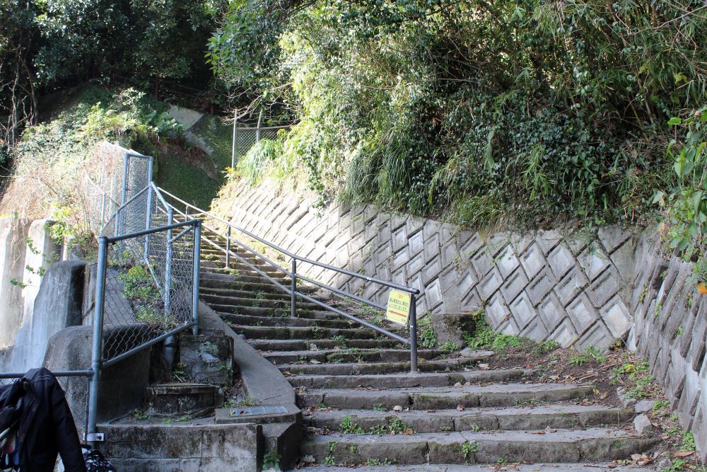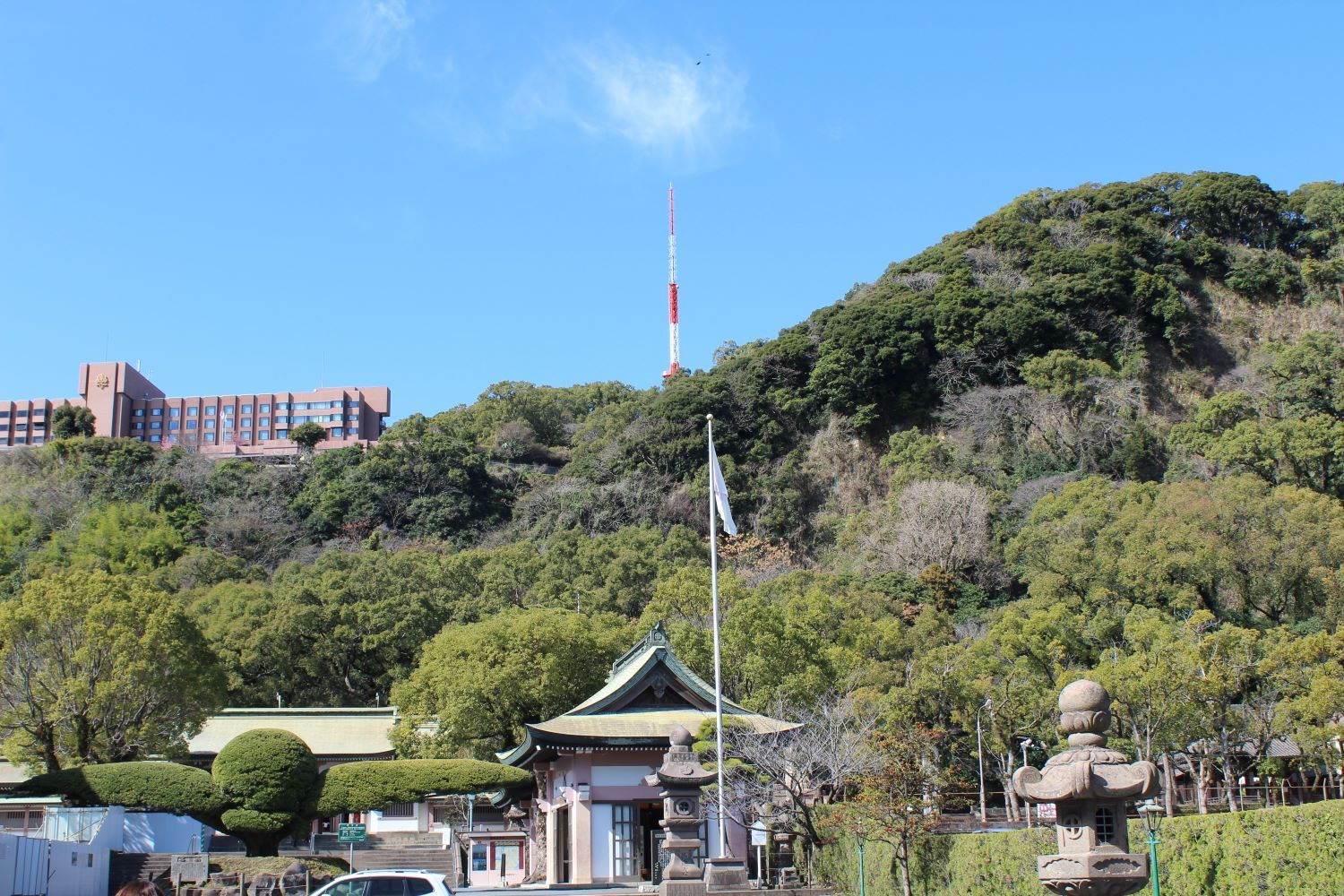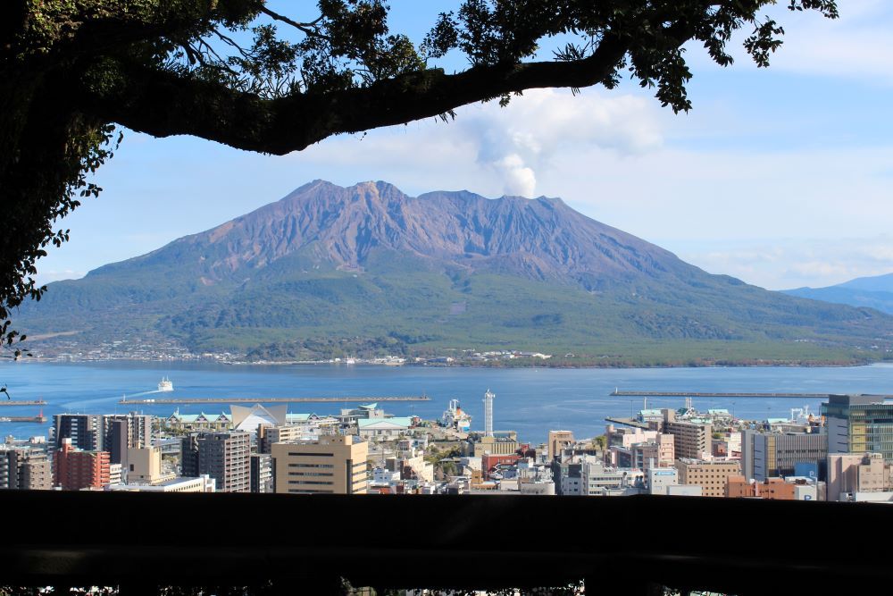 照国神社の境内裏にある路地を進むと長い石段の坂があり、城山公園内の展望台へ向かうことができます。展望台からは鹿児島市内を眼下に見ながら正面に桜島の雄大な姿がみられ、また天気がいい日には薩摩半島の南端にある開聞岳(かいもんだけ)も見ることができます。
