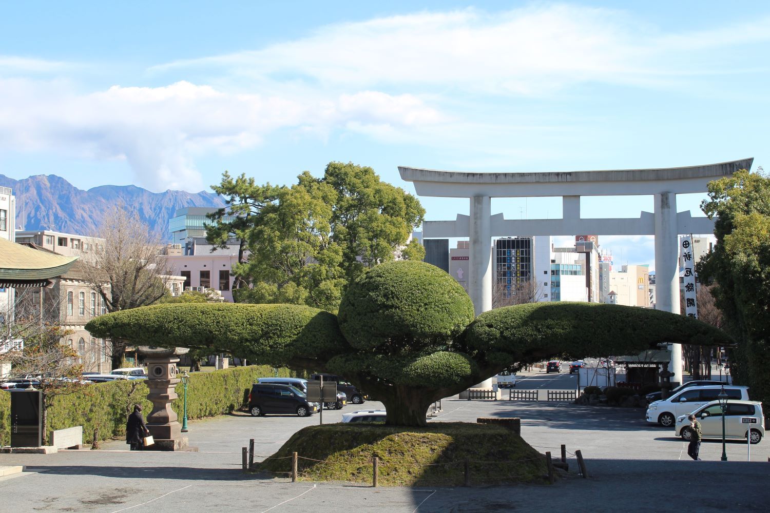 薩摩藩の11代藩主で島津家28代当主であった、島津斉彬公を祭る照国神社は、向田家旧宅からも歩いて5~6分程度と近く、境内の背後には城山が崖のようにそびえ立っています。境内から巨大な大鳥居方面に視界を向けると、煙を吐く桜島もはっきり見ることができます。大鳥居そばにある「照国文庫資料館」は、島津斉彬公をはじめ島津家代々の歴史や功績を知ることができます。