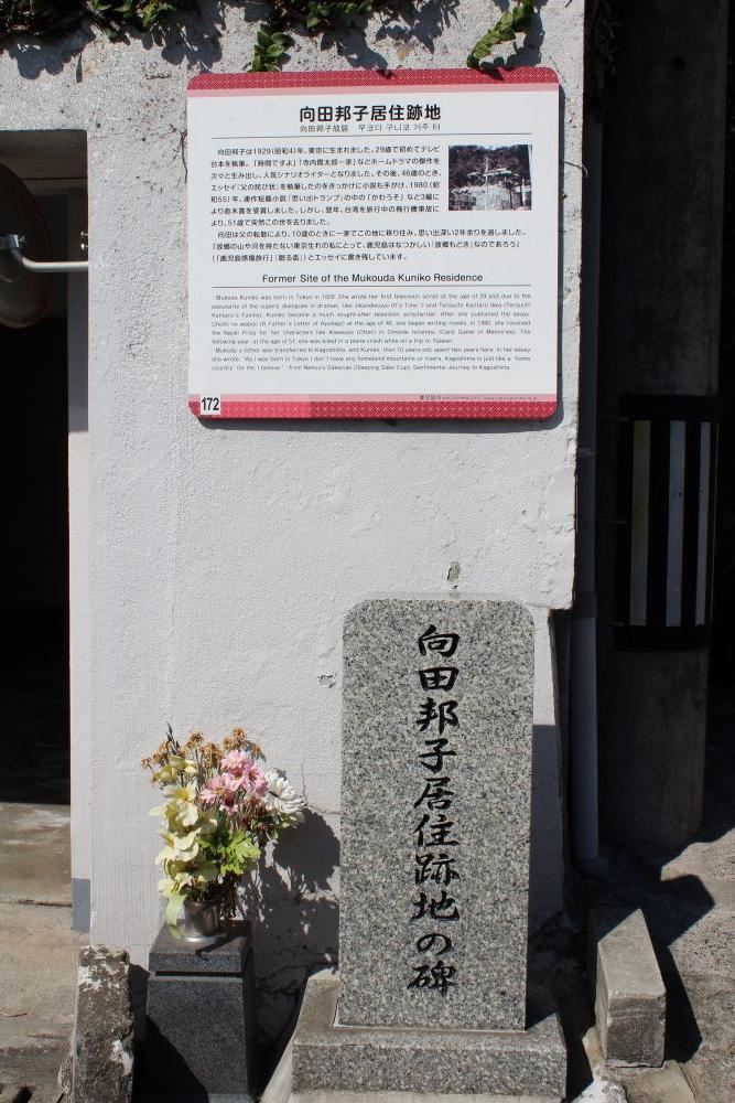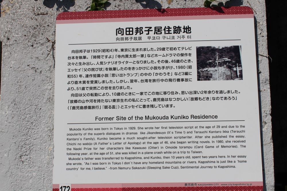 向田邦子が鹿児島で過ごした家は、45年前に本人が再訪した時にはすでにアパートに建て替わっていましたが、その場所は現在も閑静な住宅街の一角にあり、「居住跡地の碑」として石碑と説明版が建てられています。当時通っていた山下尋常小学校(現在も市立山下小学校として現存)から三官橋通りを城山方面に約400m進むと跡地の案内があります。