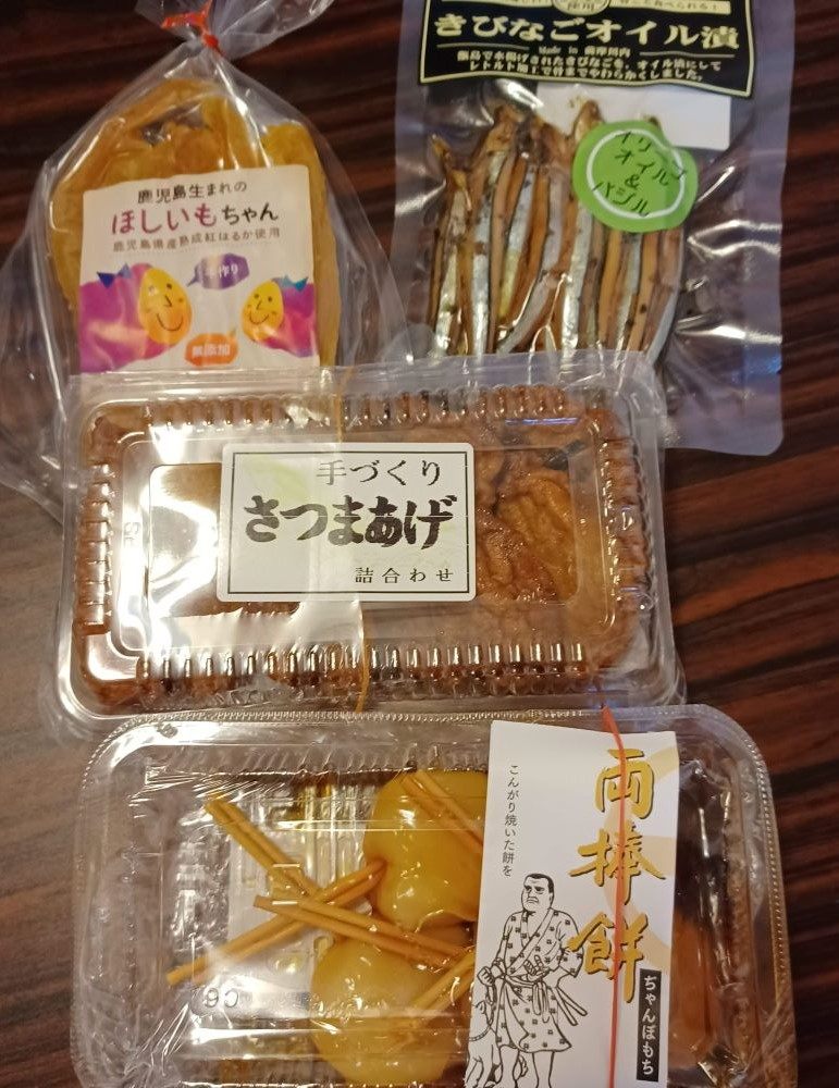 「う」の引き出しに全国の<うまいもの>情報の切り抜きを入れていたほど、おいしいものに目がなかった向田邦子がエッセイでも書いていた、さつま揚げや両棒餅(ぢゃんぼもち)など、鹿児島の名産を食べてみたいと思い探してみました。今回は下記の名産を天文館通の土産物屋で手に入れることができました。