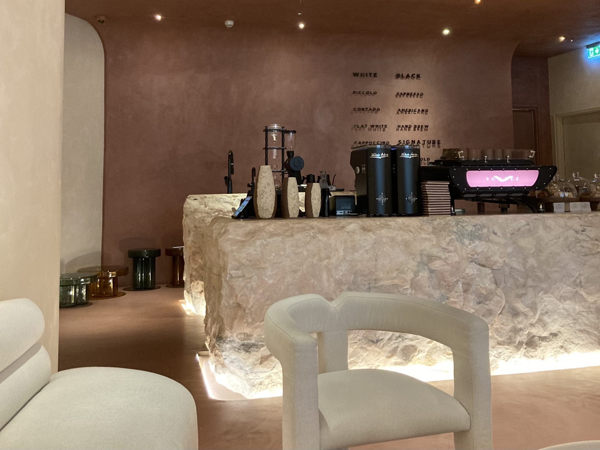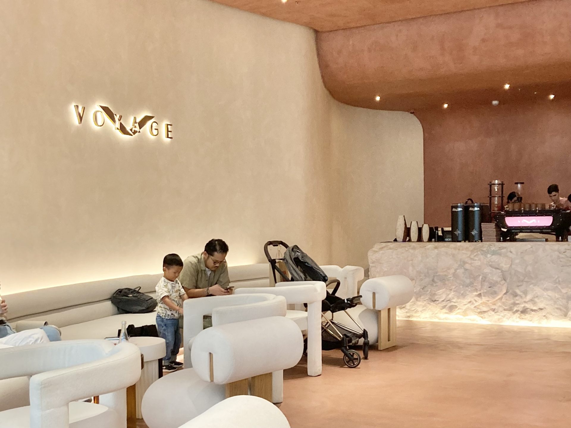 「ボヤージュ(Voyage)」はドバイ最大級のショッピングモール内にあるコーヒー専門店。ナチュラルな色合いを基調とした空間には、北欧風の洗練されたスタイリッシュな椅子やテーブルが並びます。どこか優しい温もりを感じる店内はとても居心地がよく、ショッピングの人混みから離れてひと息つくのにぴったりです。