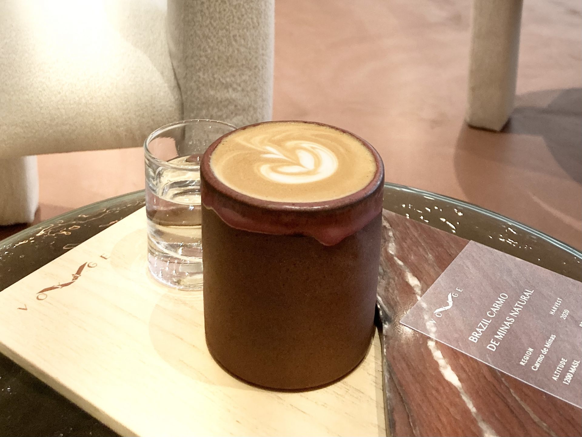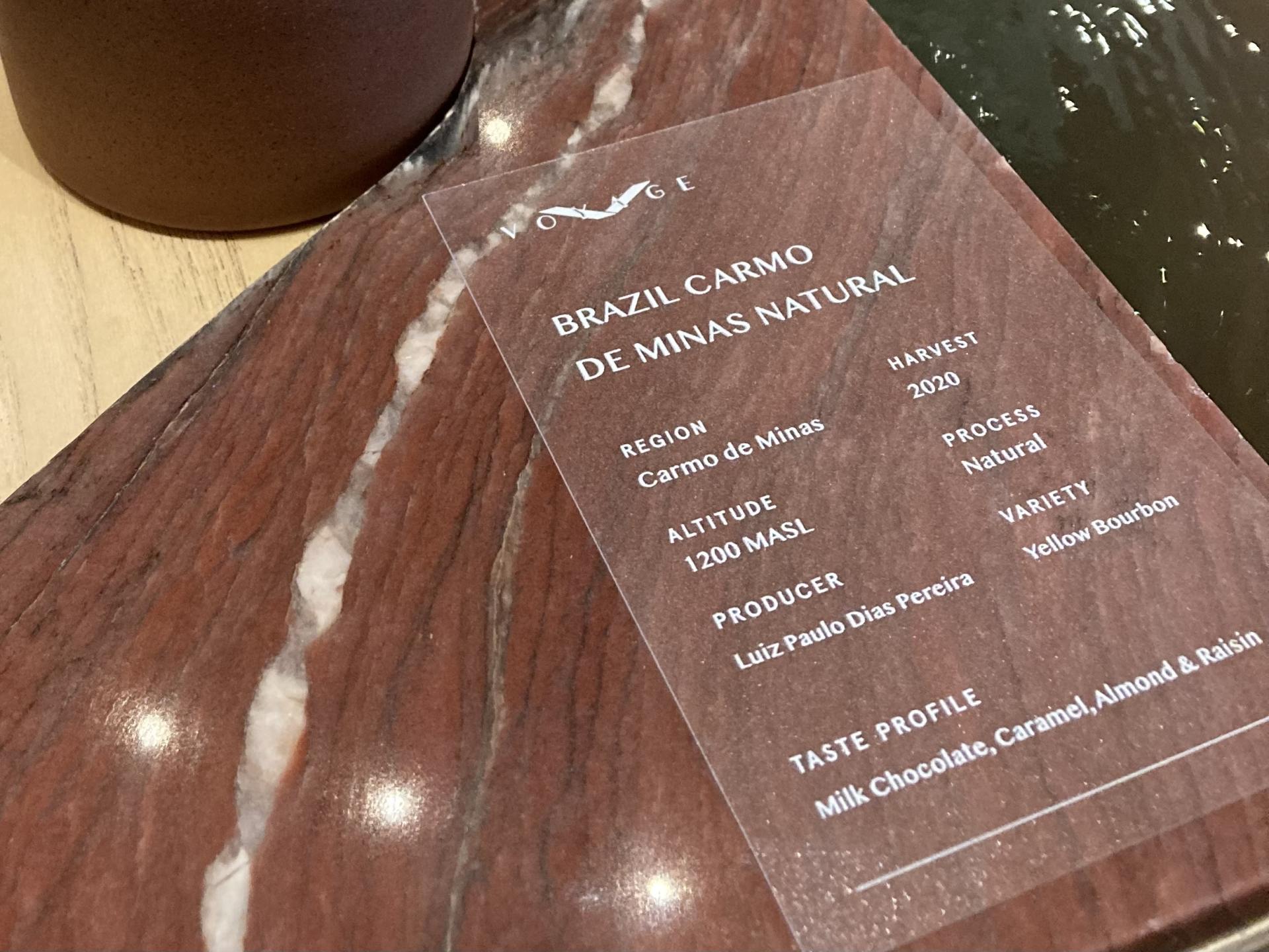 「ボヤージュ」でコーヒーをオーダーすると、その特徴が分かるプロファイルとともに運ばれてきます。このプロファイルによると、産地:ブラジル、カルモ・デ・ミナス、標高:1200m、品種:イエローブルボンと書かれています。また、ミルクチョコレートやキャラメル、アーモンド、レーズンのようなコクや甘み、香りが特徴のコーヒー豆であることもわかりますね。実際にコーヒーを味わいながら、アロマや酸味、質感、余韻を楽しんでみましょう。