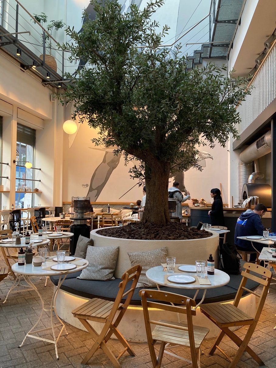 中に入ってまず目に飛び込むのが、吹き抜け天井からの陽を浴びて元気いっぱいのオリーブの木!