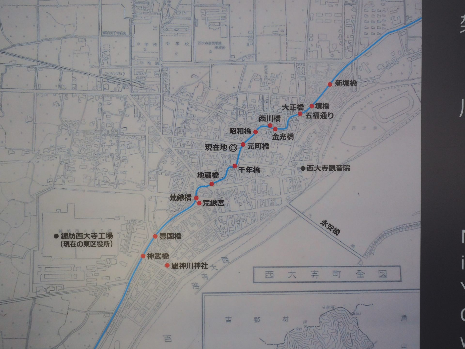 用水路と橋の詳しい図面も記載されていました。最初に見た橋は「堀川橋」なので、用水路のいちばん北側にある橋だったことがわかりました。