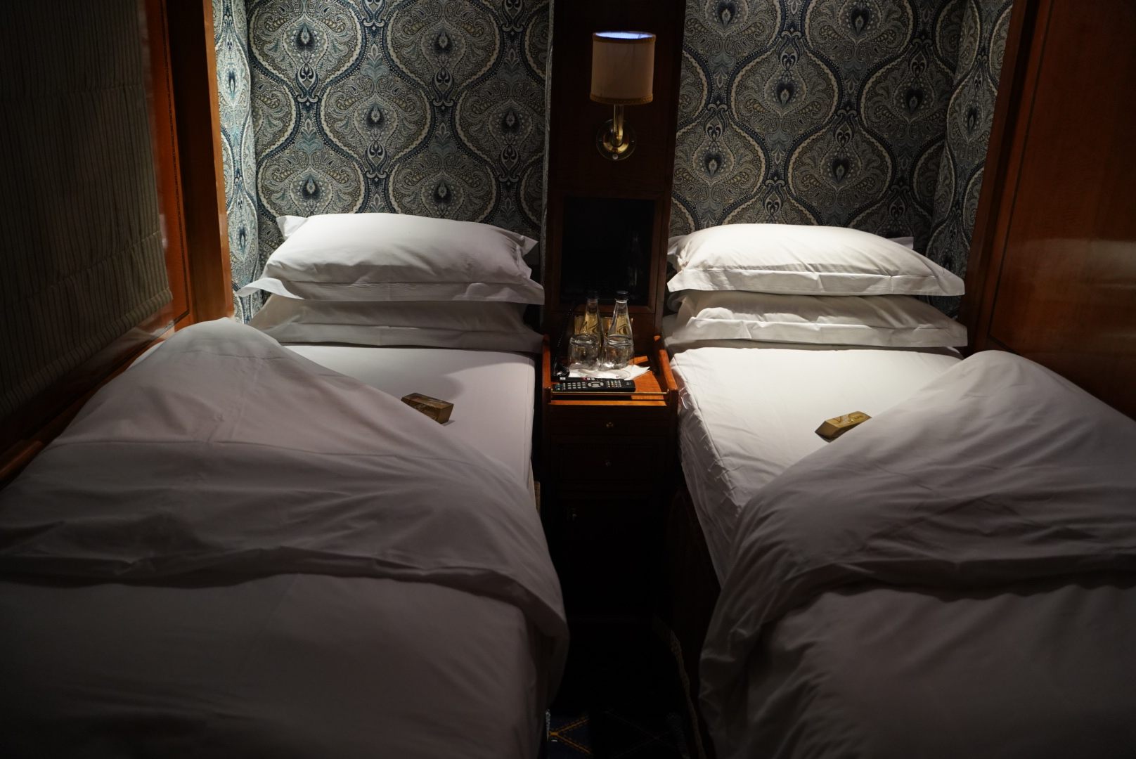 お部屋は列車の中とは思えないほど豪華で、昼間はソファが並んだリビングルームが、夜間はベッドルームに変わってゆっくりくつろげました!