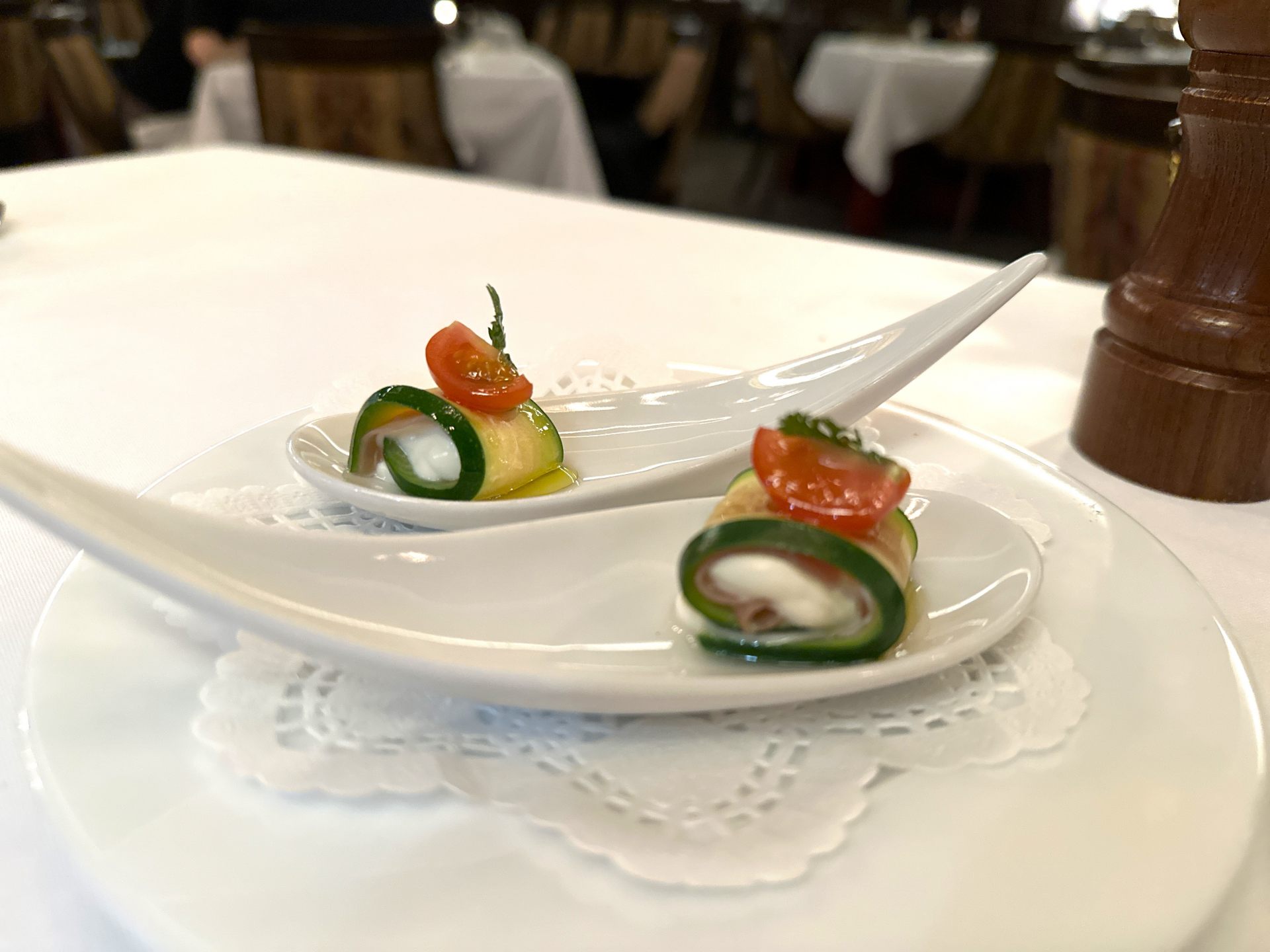 ズッキーニと生ハムを使った生ハムロール、中にはリコッタチーズが挟まれています。