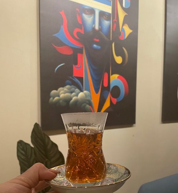 レストラン屋内は、素敵なインテリアのテーブル席があり、オーナーさんの作品(アーティスト)が展示されている空間です。非常にインパクトのある作品ですね。ここで定番の紅茶を飲みました。