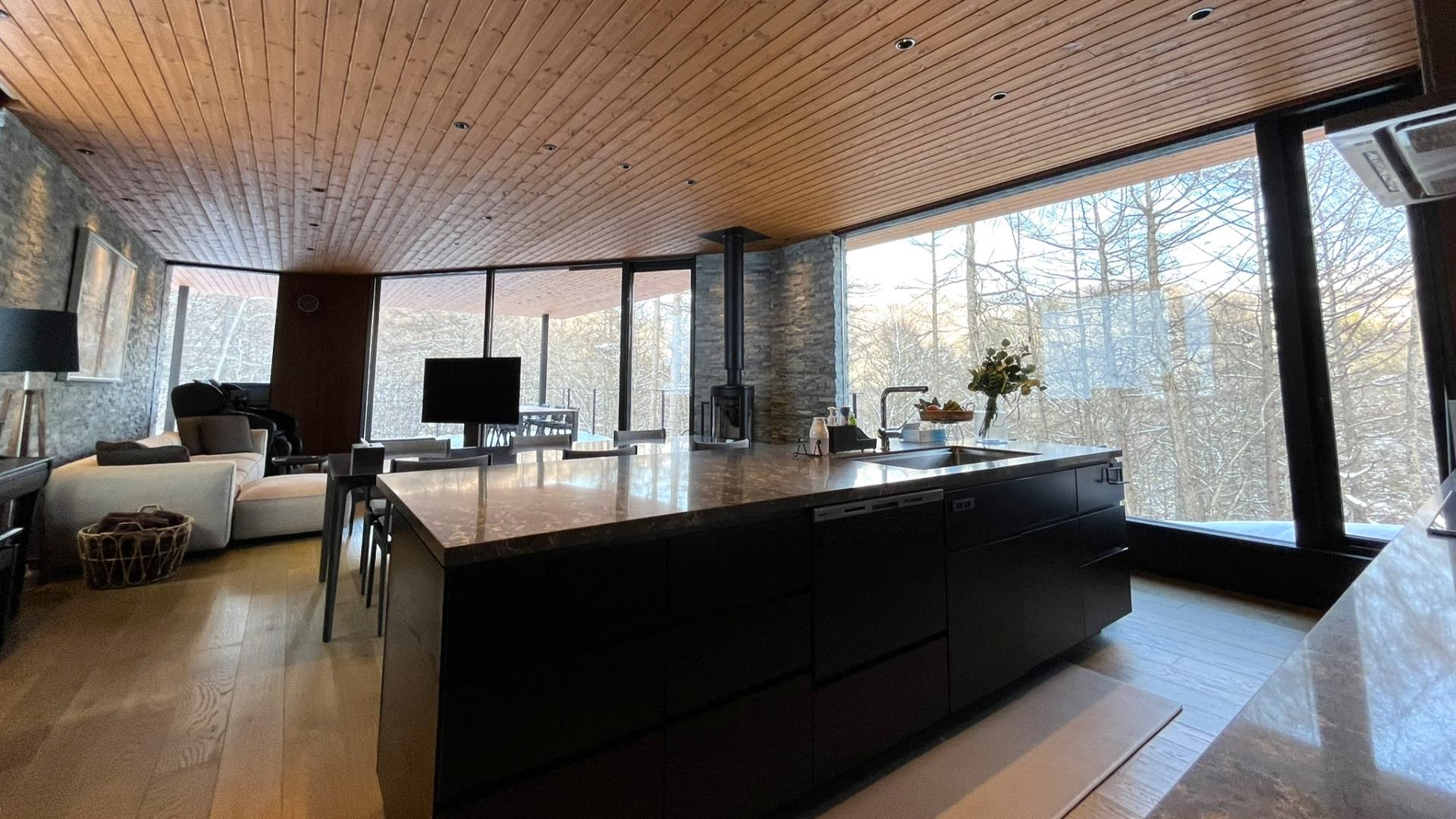 リビングからの景色は見渡す限り、軽井沢の森。4,254㎡の広い敷地に1棟だけの別荘。プライベート感は抜群です。3LDKの6ベッド。シアタールームやサウナ、ガレージもついたハイクオリティな別荘です。