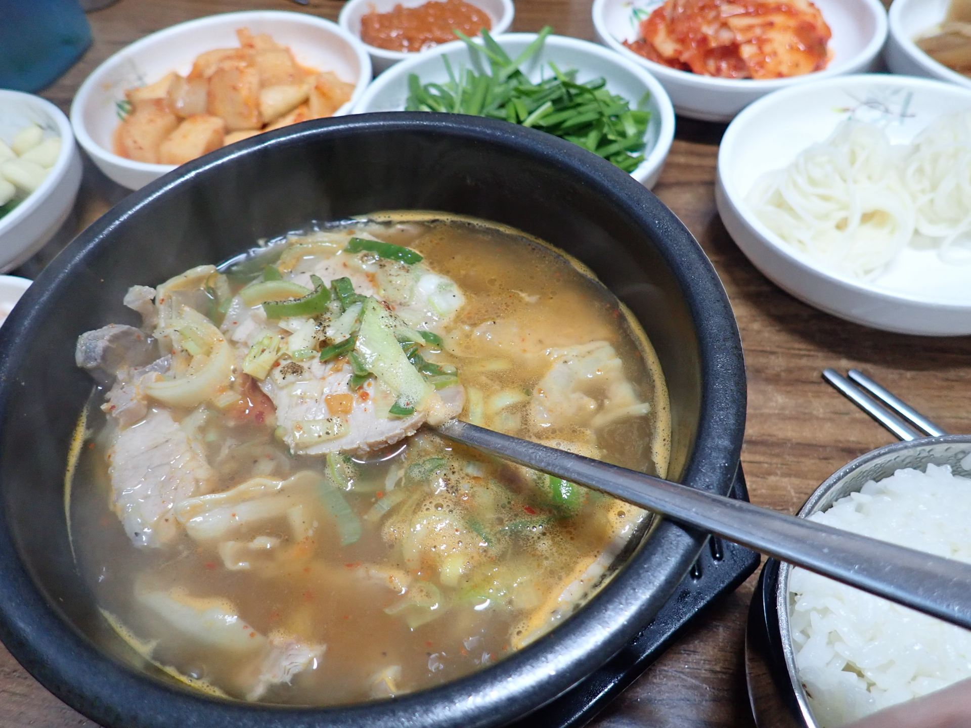 直訳すると豚のスープご飯ですが、豚の骨と肉をじっくり煮込んで作られたスープです。熱々のスープにニラをたっぷり入れて食べます。ご飯を混ぜて食べてもよしで、ボリューム満点のお腹を満たしてくれる料理です。