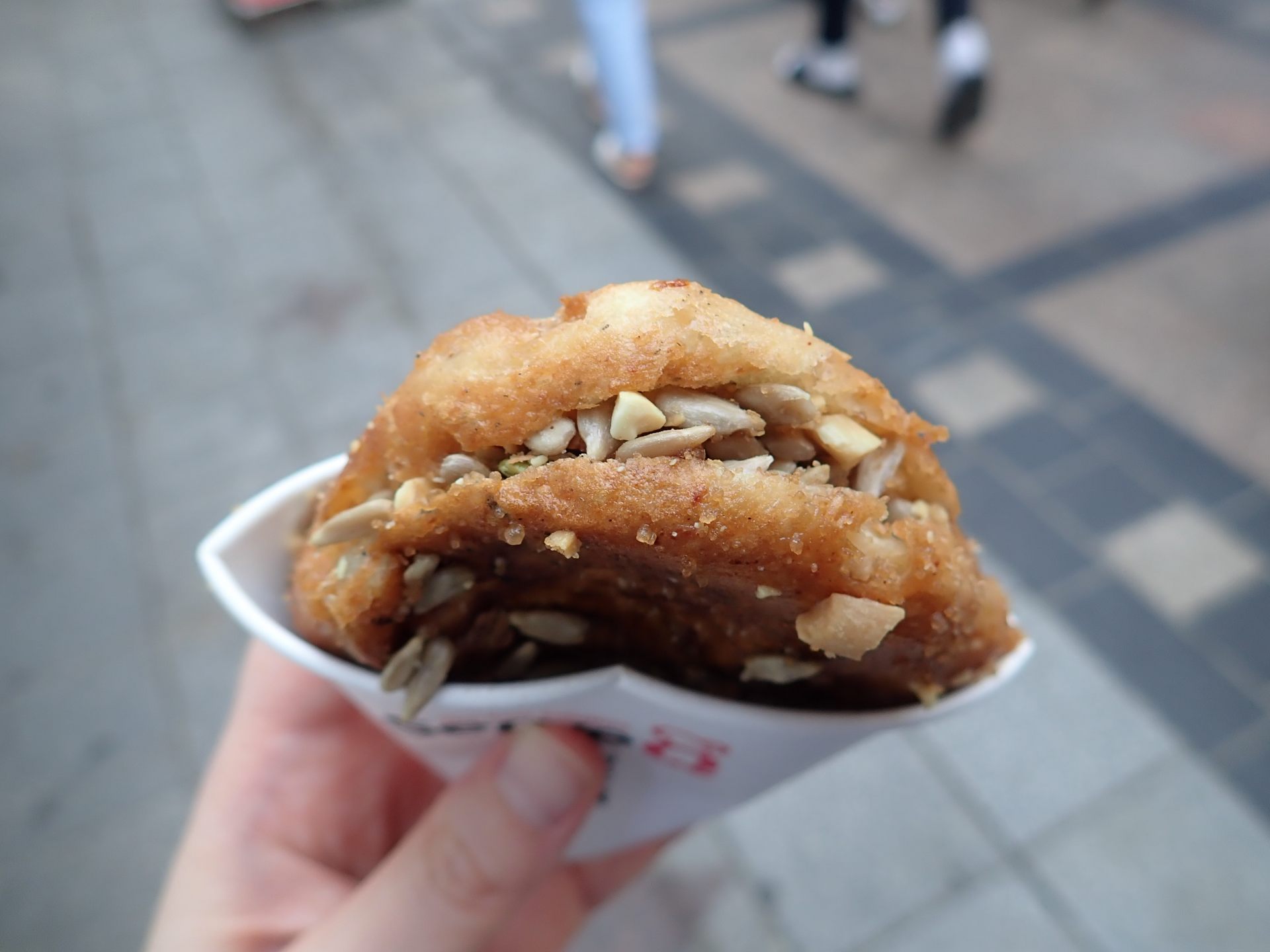 シアとは穀物や野菜の種のことで、中にぎっしりそれらと砂糖やシナモンが入っています。揚げパンのような感じで購入直後は熱々ホクホクで冷ましながら歩いて食べるのがおすすめです。