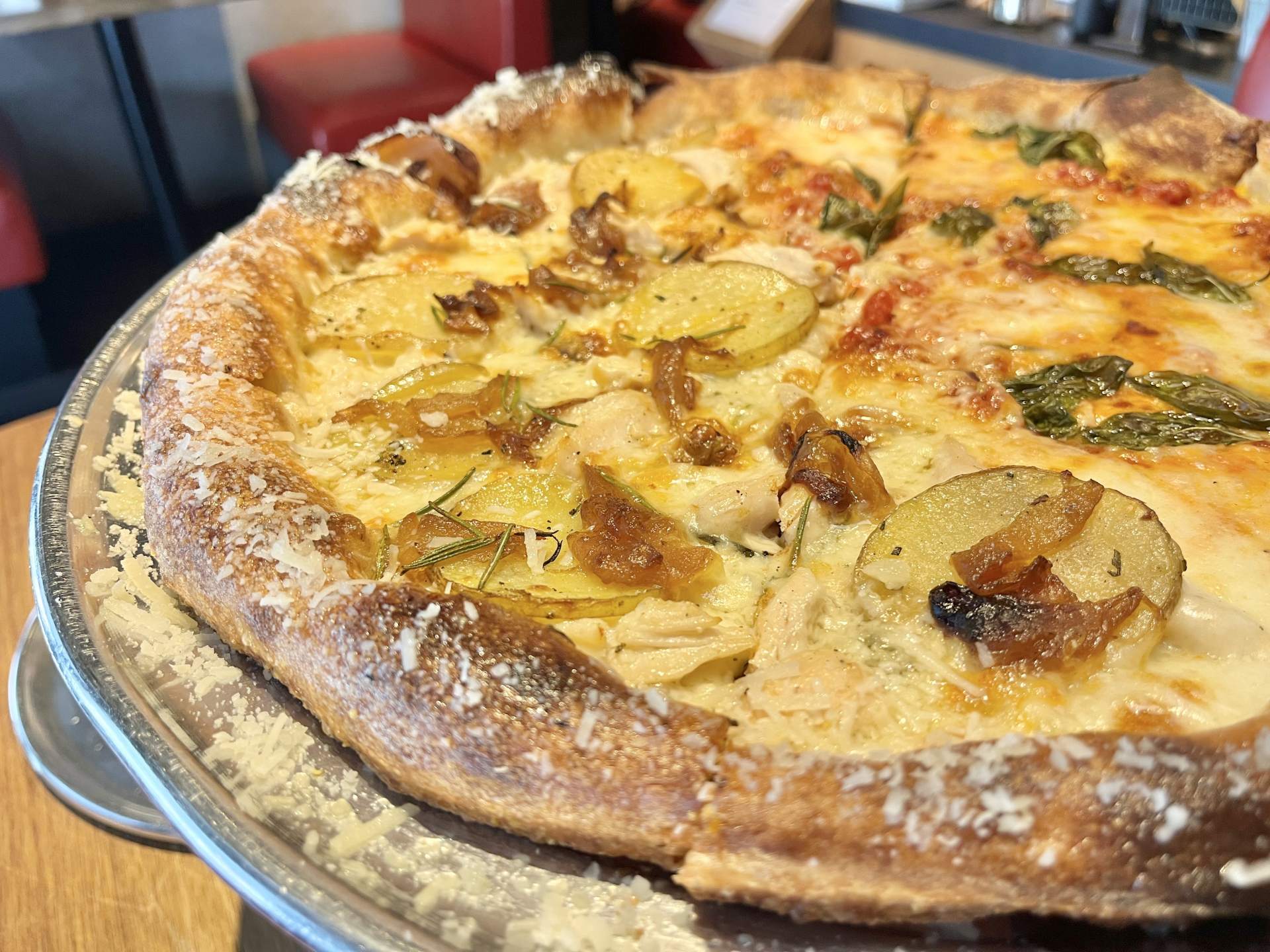 「ピットファイヤーピザ」のピザの具材なんと20種類も! 定番のマルゲリータやペパロニのほか、ハワイアンや、トリュフピザも。薄切りのじゃがいもとチキンがのった「スプドニック(Spudnick)」はローズマリーがアクセントでとってもおいしい! 味に迷ったらハーフ&ハーフ(Lサイズのみ)にして2倍味わってみては?