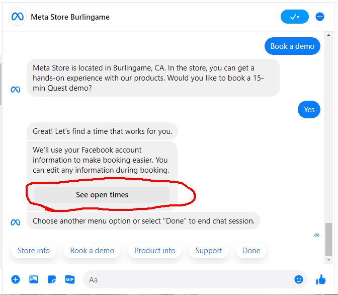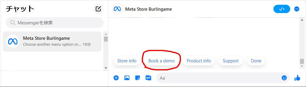 このページで、左下の「Book demo」を選ぶと、Facebook Messengerが動き、次の画面になります。FBメッセンジャーにログインしてください。