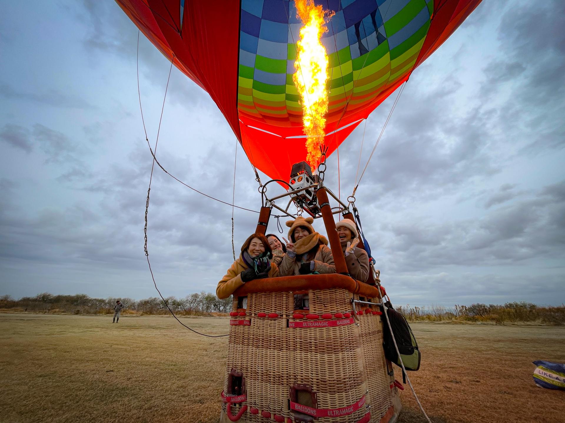 ある程度バルーンが膨むと、ゆっくりと地面から離れ始めます。バルーンがゴンドラの真上まできたら準備OK。パイロットとともにゴンドラに乗り込み、空中散歩のスタートです。