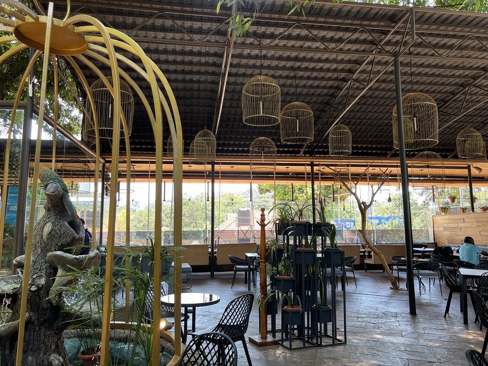 噴水や樹木でデコレートされており、贅沢にスペースが使用されています。通りに面したテーブル席の座席はブランコになっていました。