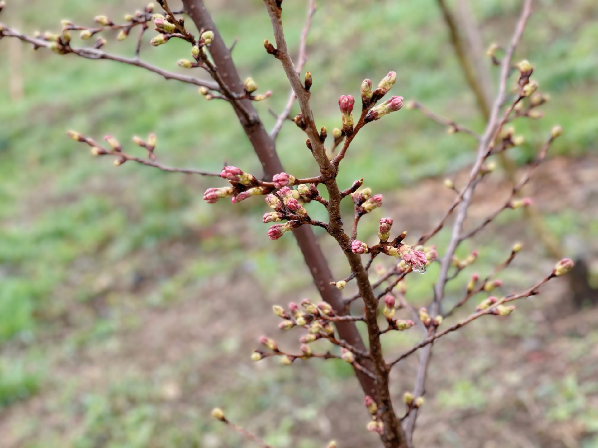 参考に、先日トビリシ市内のジョージア国立植物園で見た桜の木の様子も紹介します。こう見ると、桜の方が幹から花びらまでの枝部分(花柄)が長いことが分かりますね。